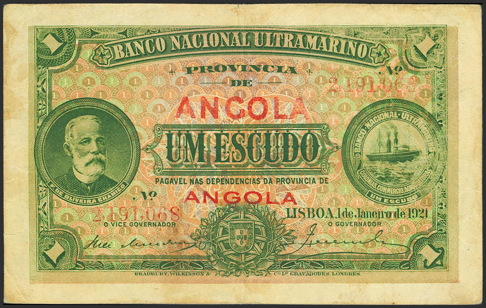 ANGOLA. 1 Escudo. 1 January 1921. Banco Nacional Ultramarino. (Pick: 55). Repaired tears. More than Very Fine.