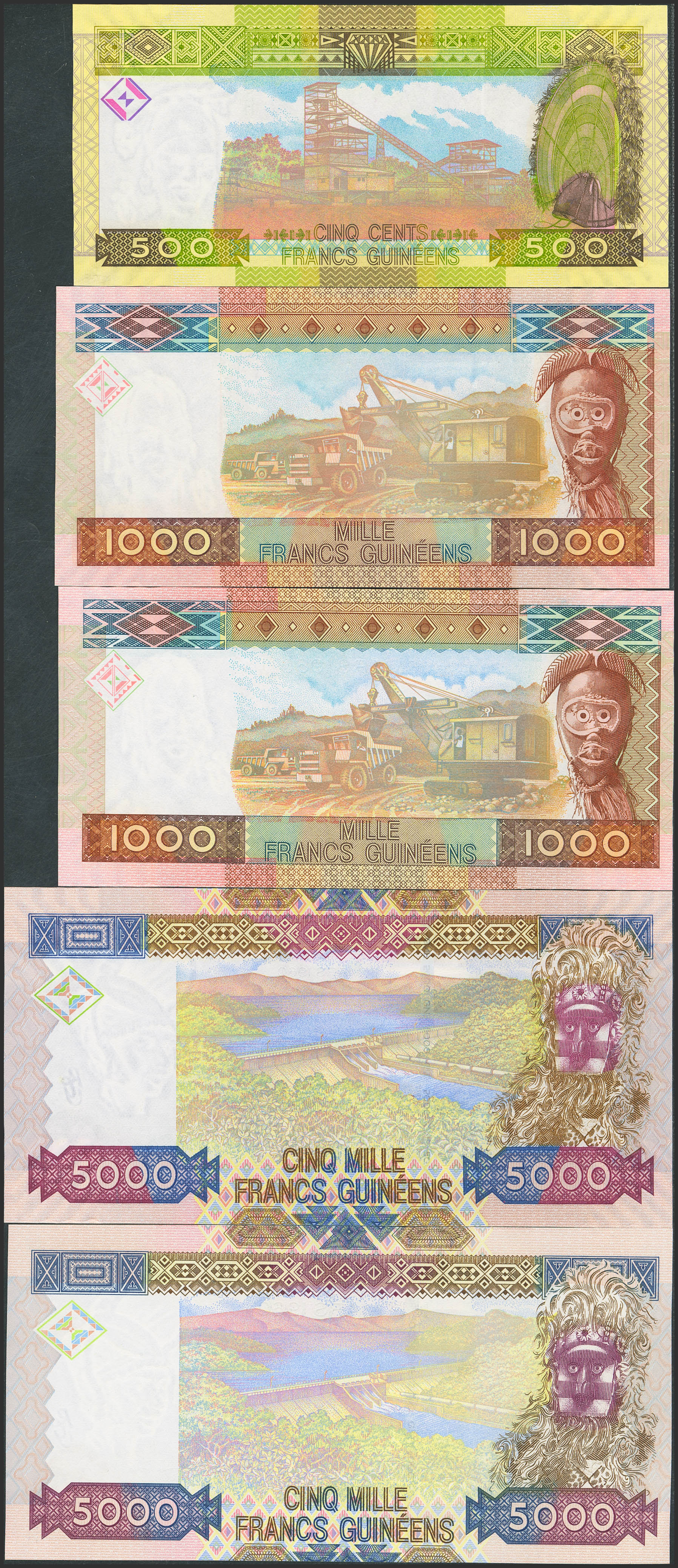 GUINEA. Lot of 5 notes from 500 to 5000 Francs. 2006 and 2010. Banque Centrale. (Pick: 39a, 40, 41a, 43a, 44b). Uncirculated.
