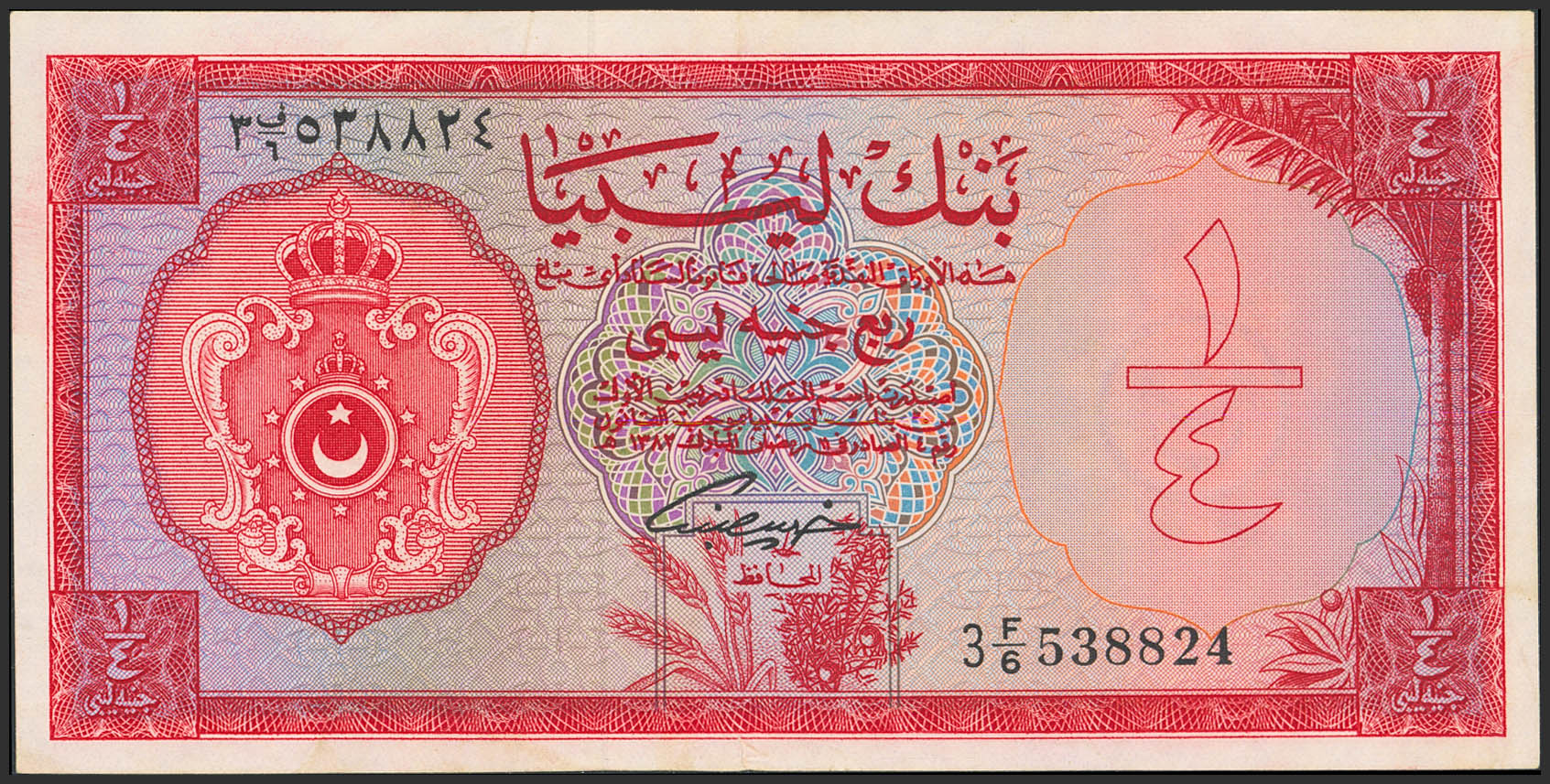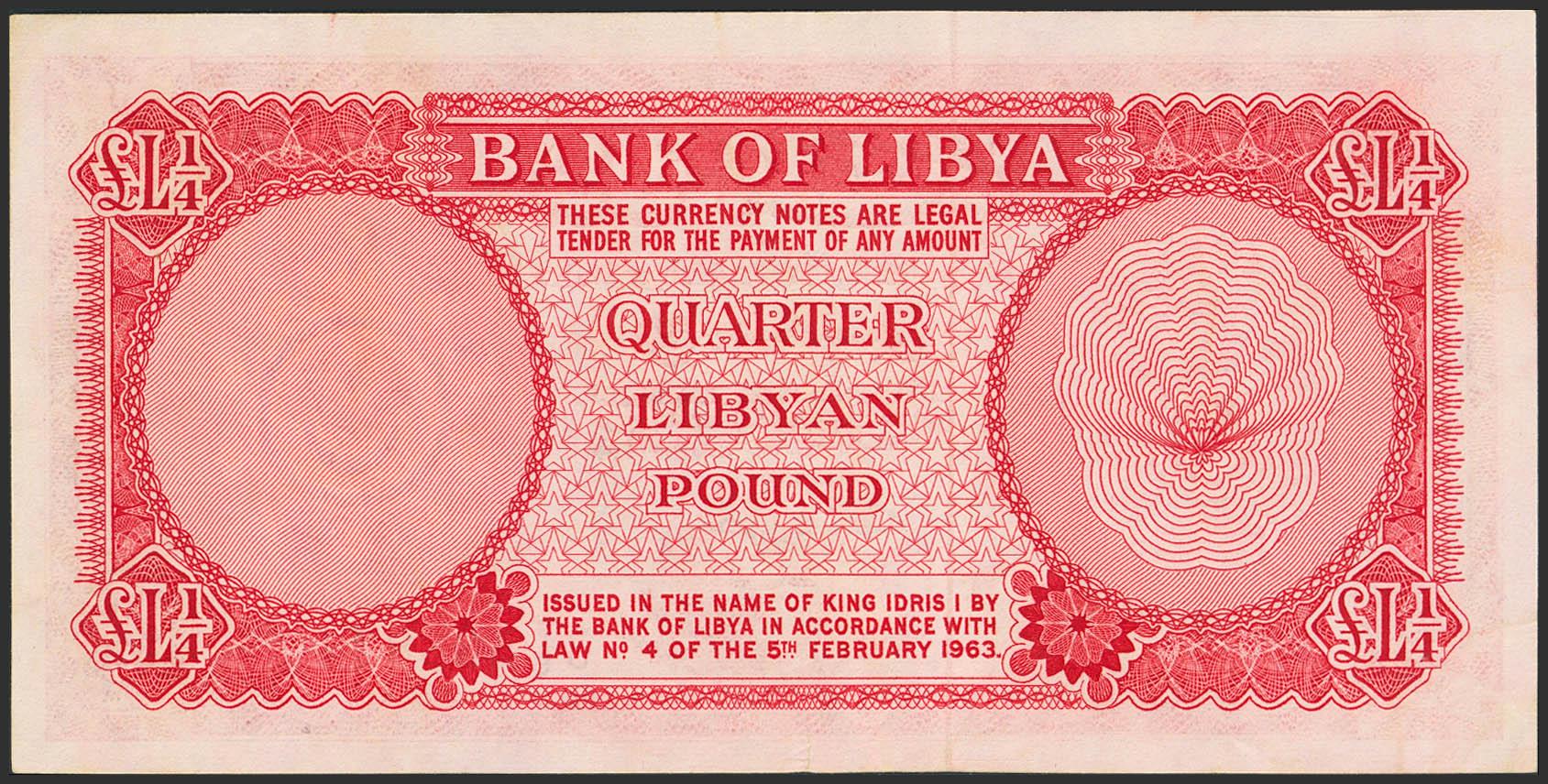 LIBYA. ¼ Libyan Pound. 5 February 1963. Bank of Libya. (Pick: 23a). More than Extremely Fine.