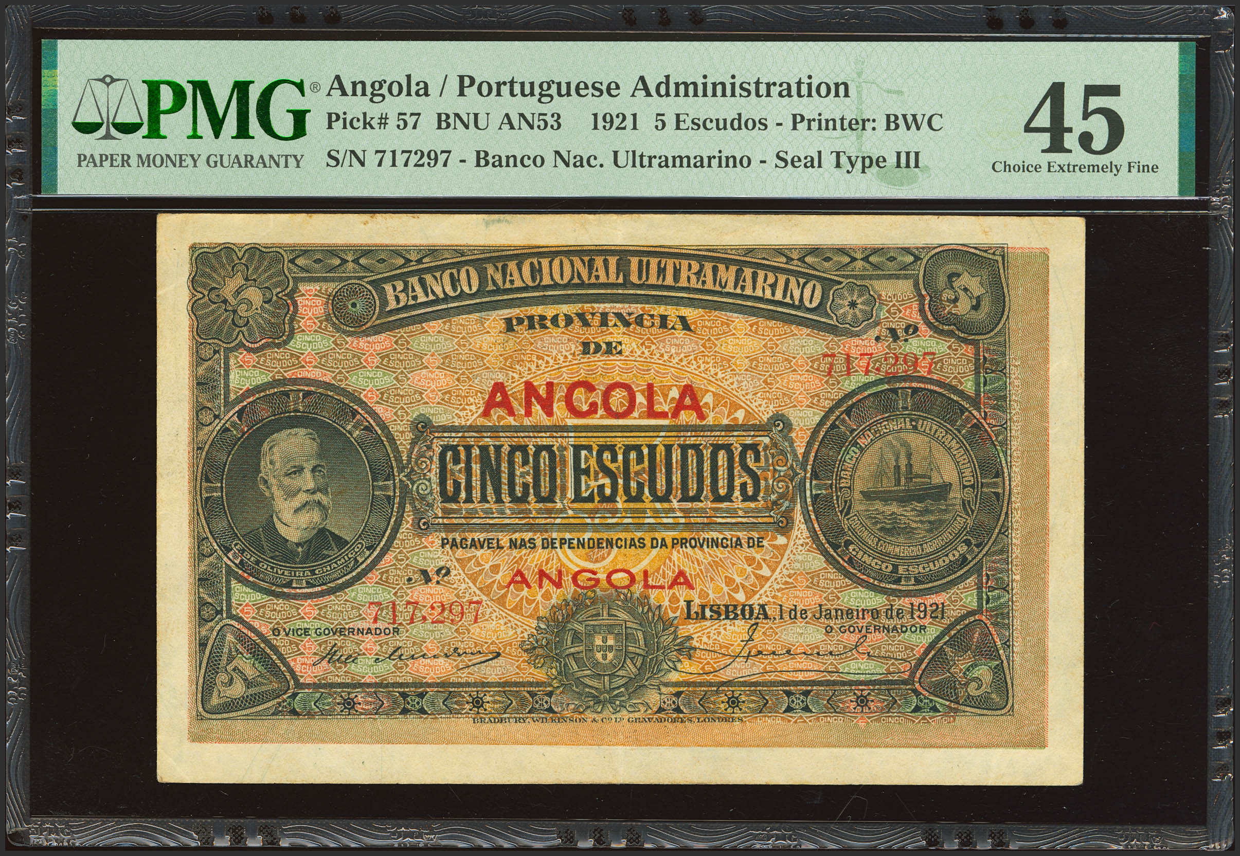 ANGOLA. 5 Escudos. 1 January 1921. Banco Nacional Ultramarino. (Pick: 57). PMG45.
