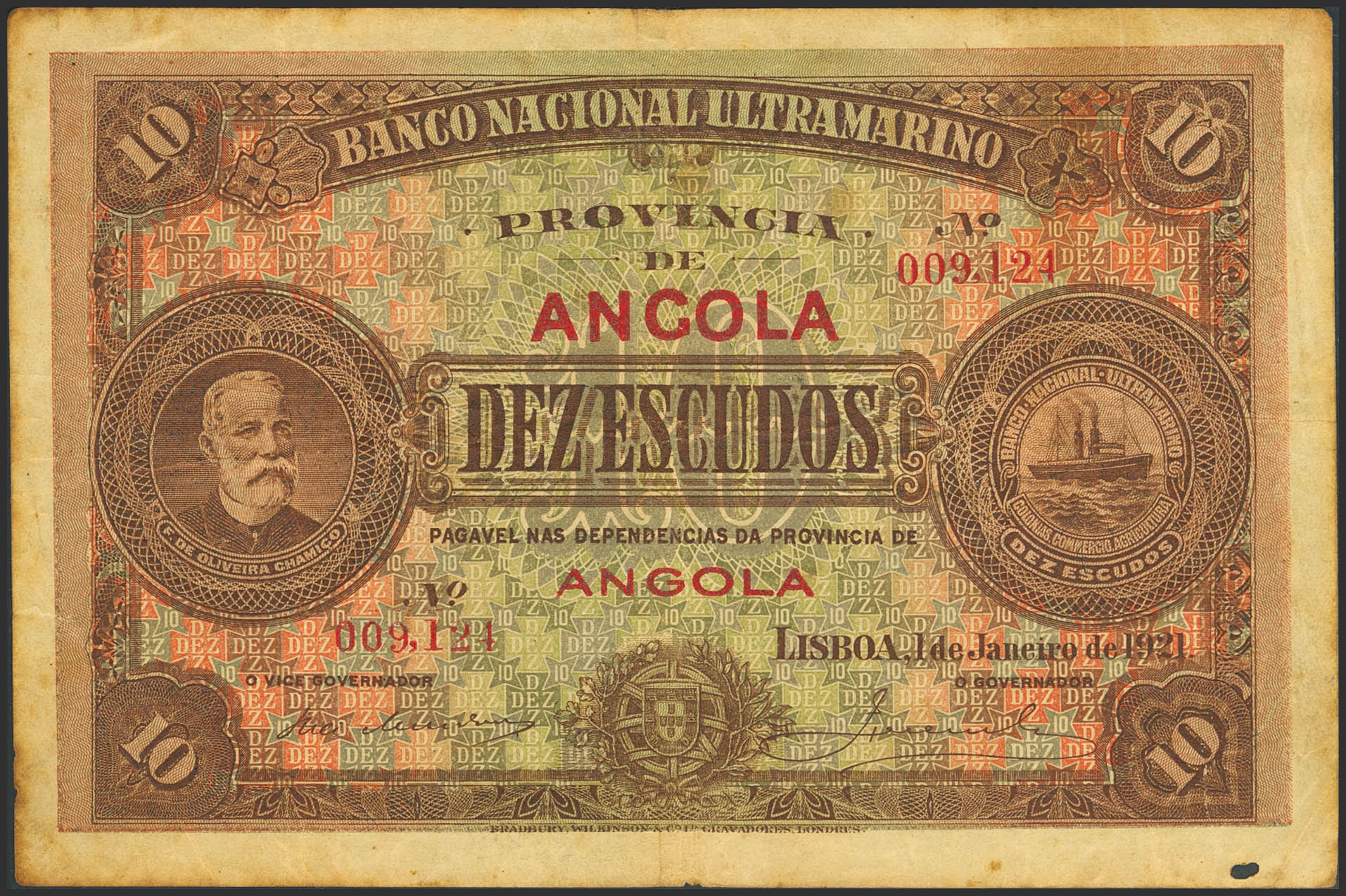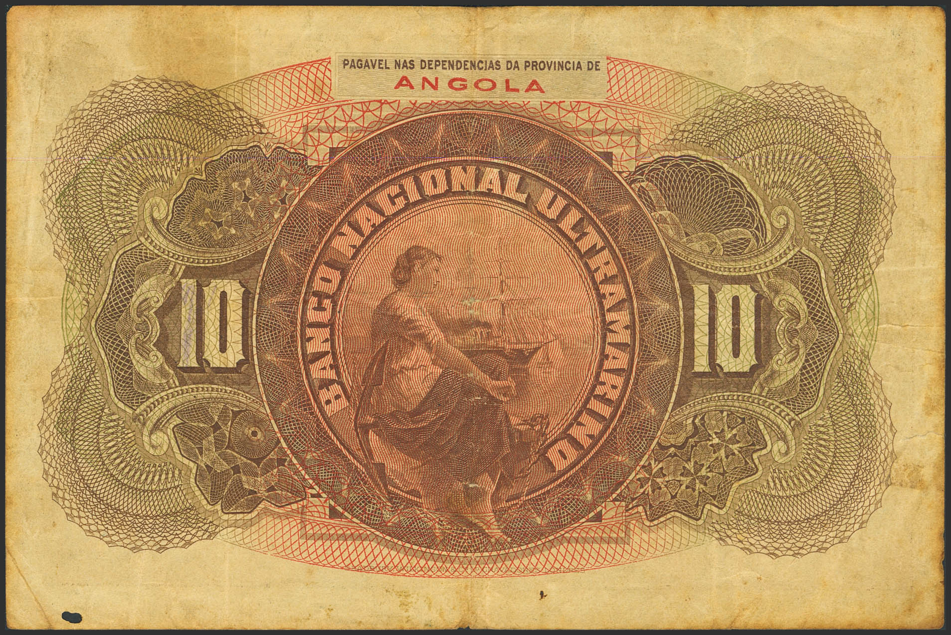 ANGOLA. 10 Escudos. 1 January 1921. Banco Nacional Ultramarino. (Pick: 58). Wormhole on lower edge. Very Fine.