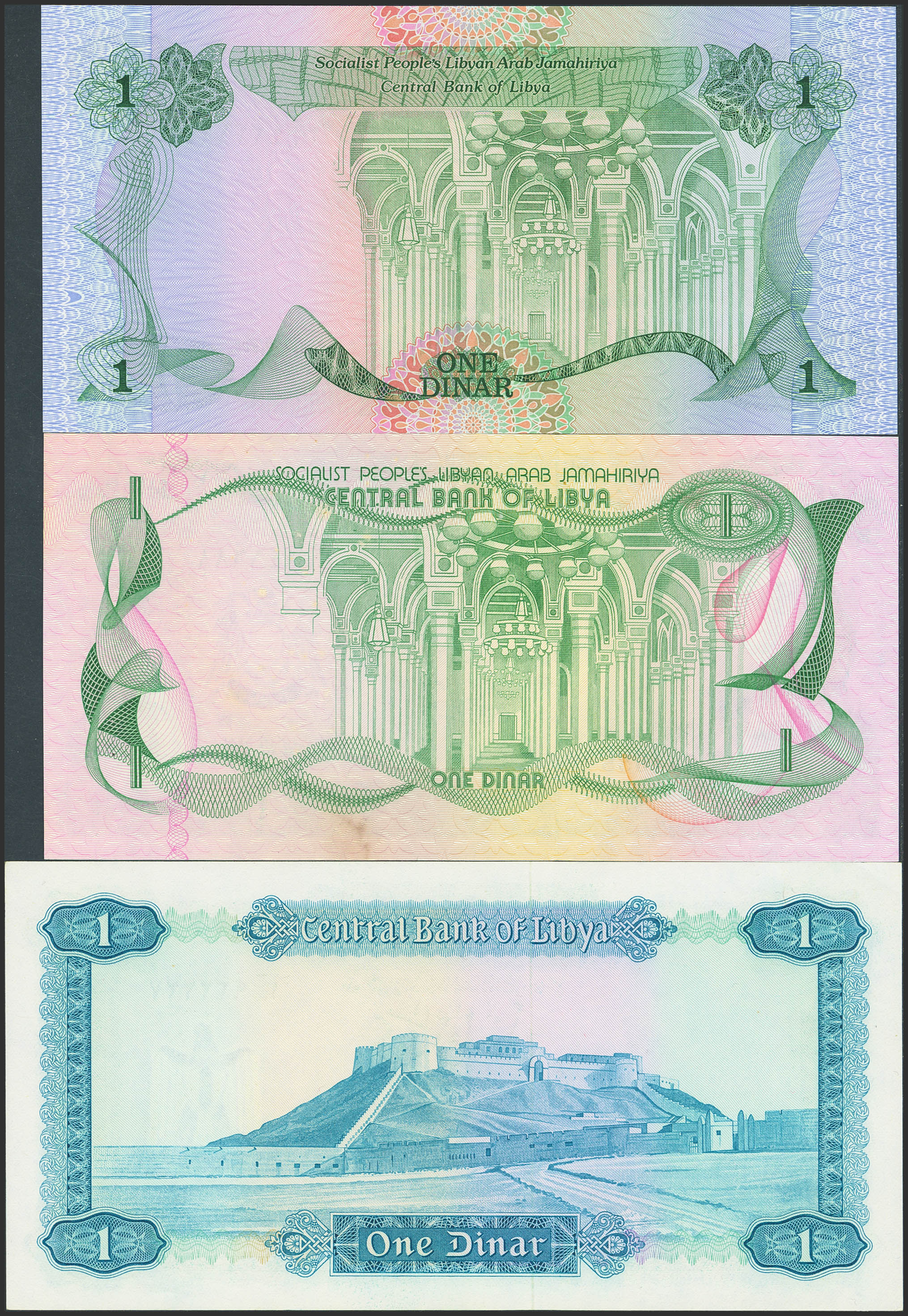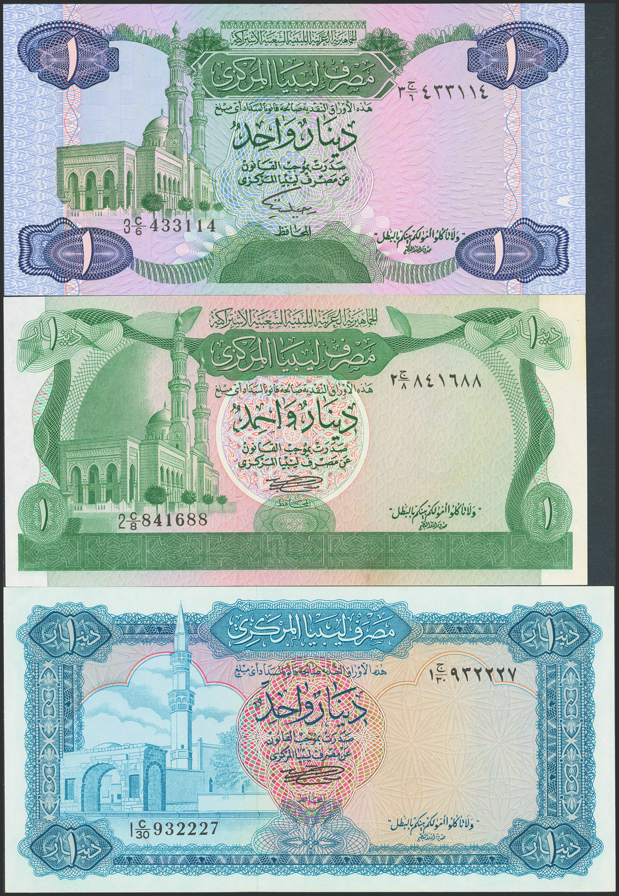 LIBYA. Lot of 3 notes of 1 Dinar. 1971 to 1984. Central Bank. (Pick: 35b, 44a, 49). Uncirculated.