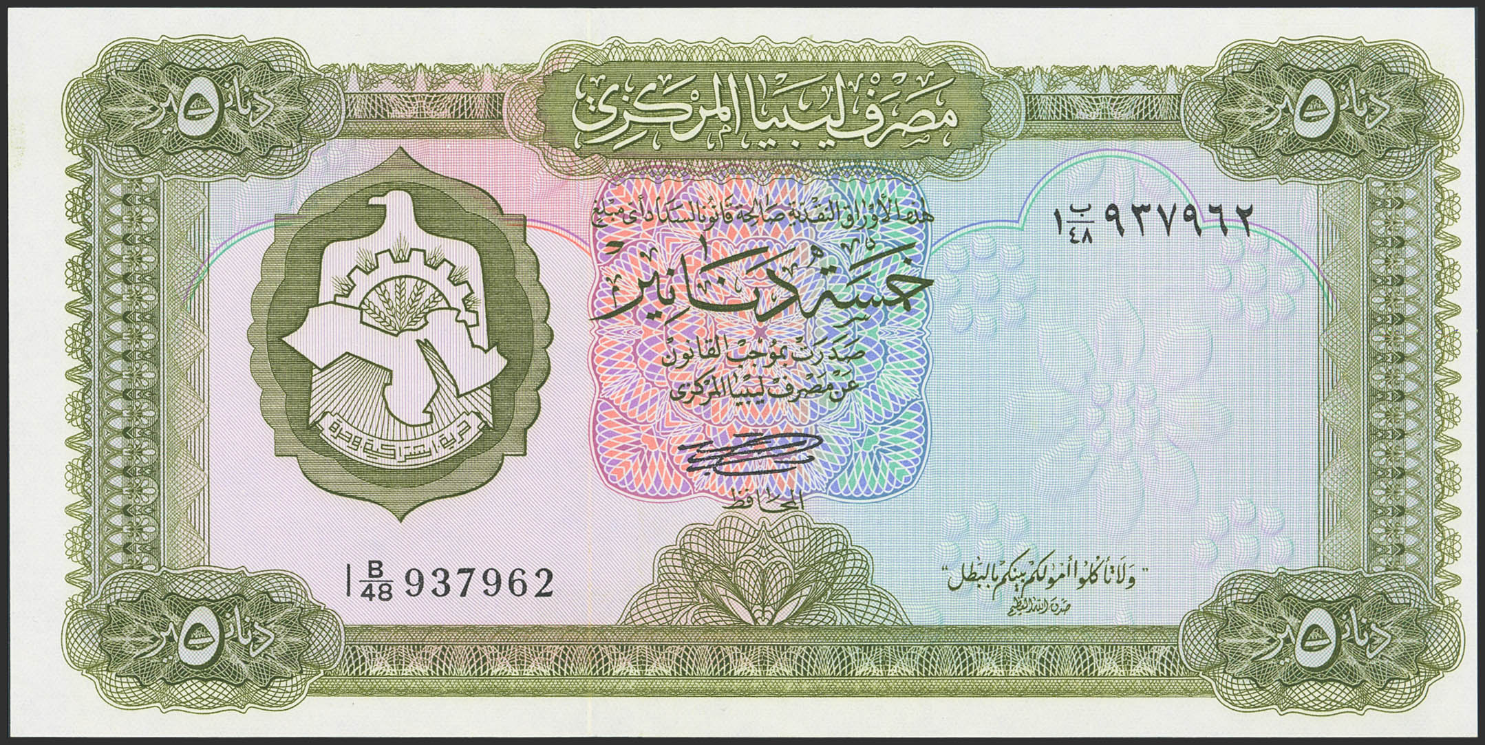 LIBYA. 5 Dinars. (1972ca). Central Bank. (Pick: 36b). Uncirculated.