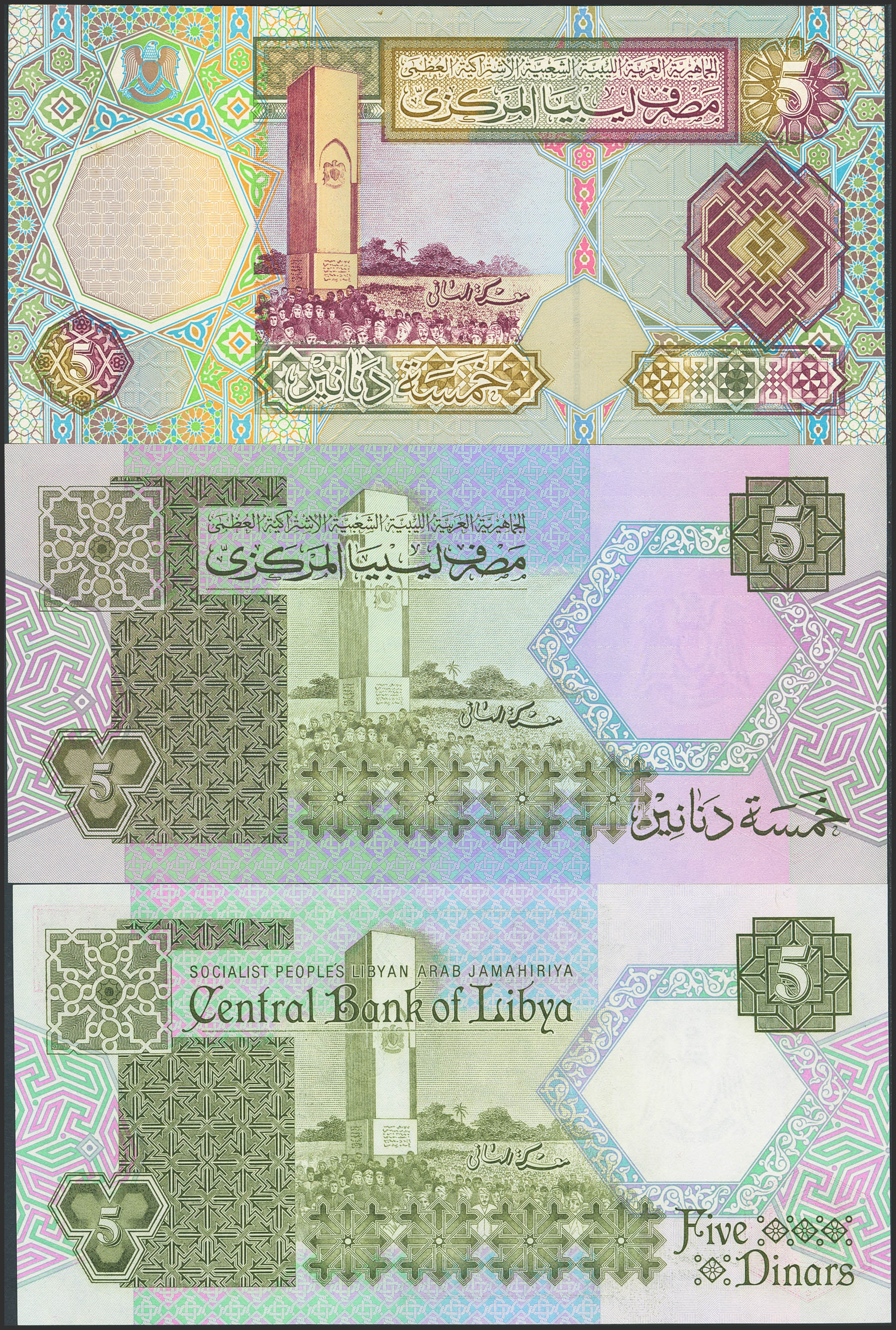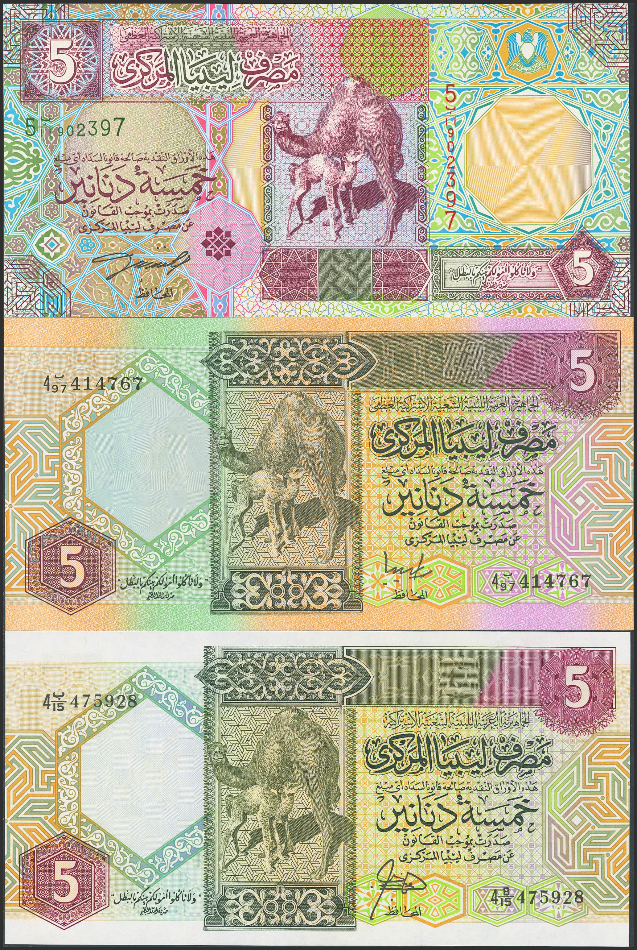 LIBYA. Lot of 3 notes of 5 Dinars. 1988 to 2002. Central Bank. (Pick: 55, 60c, 65a). Uncirculated (2), Almost Uncirculated (65a).
