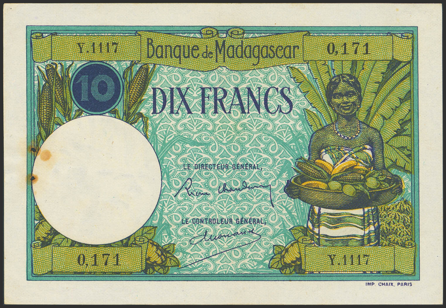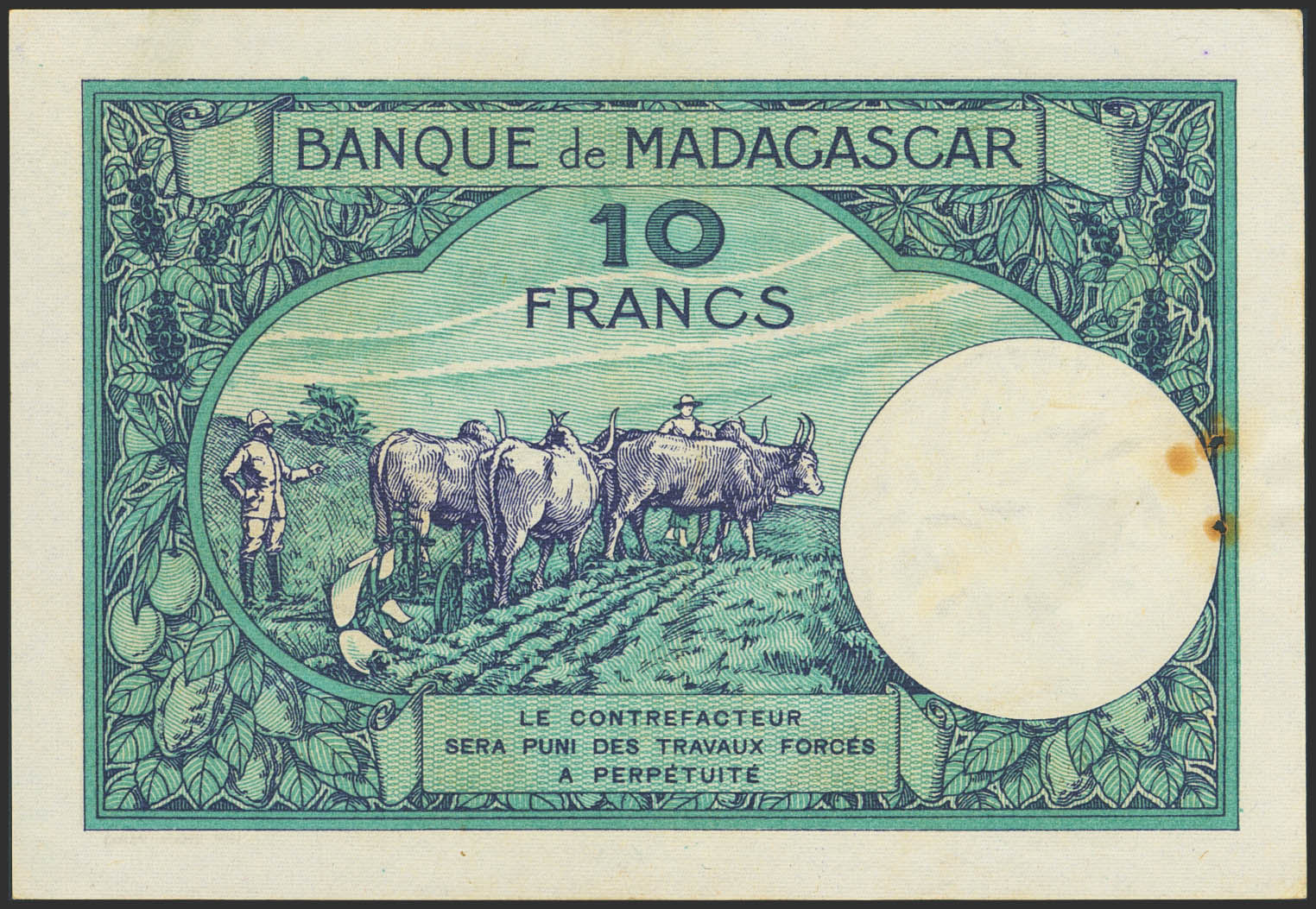 MADAGASCAR. 10 Francs. (1937ca). Banque de Madagascar. (Pick: 36). String holes. Almost Uncirculated.