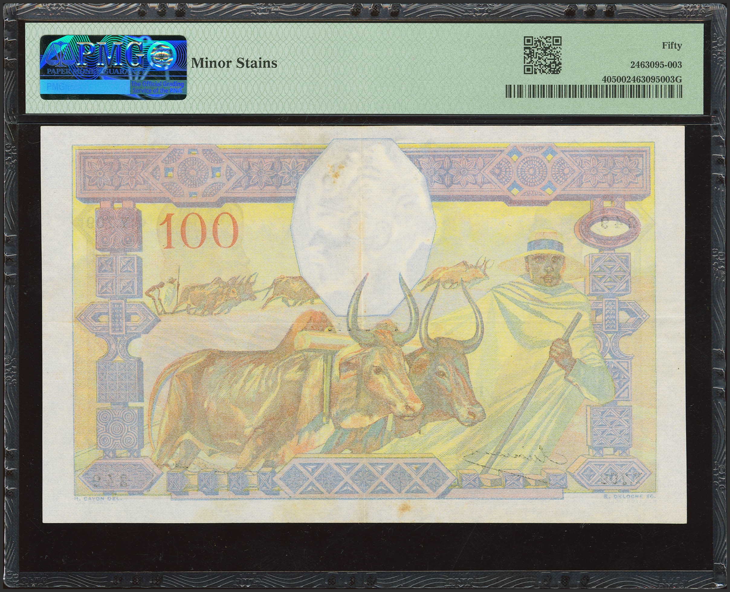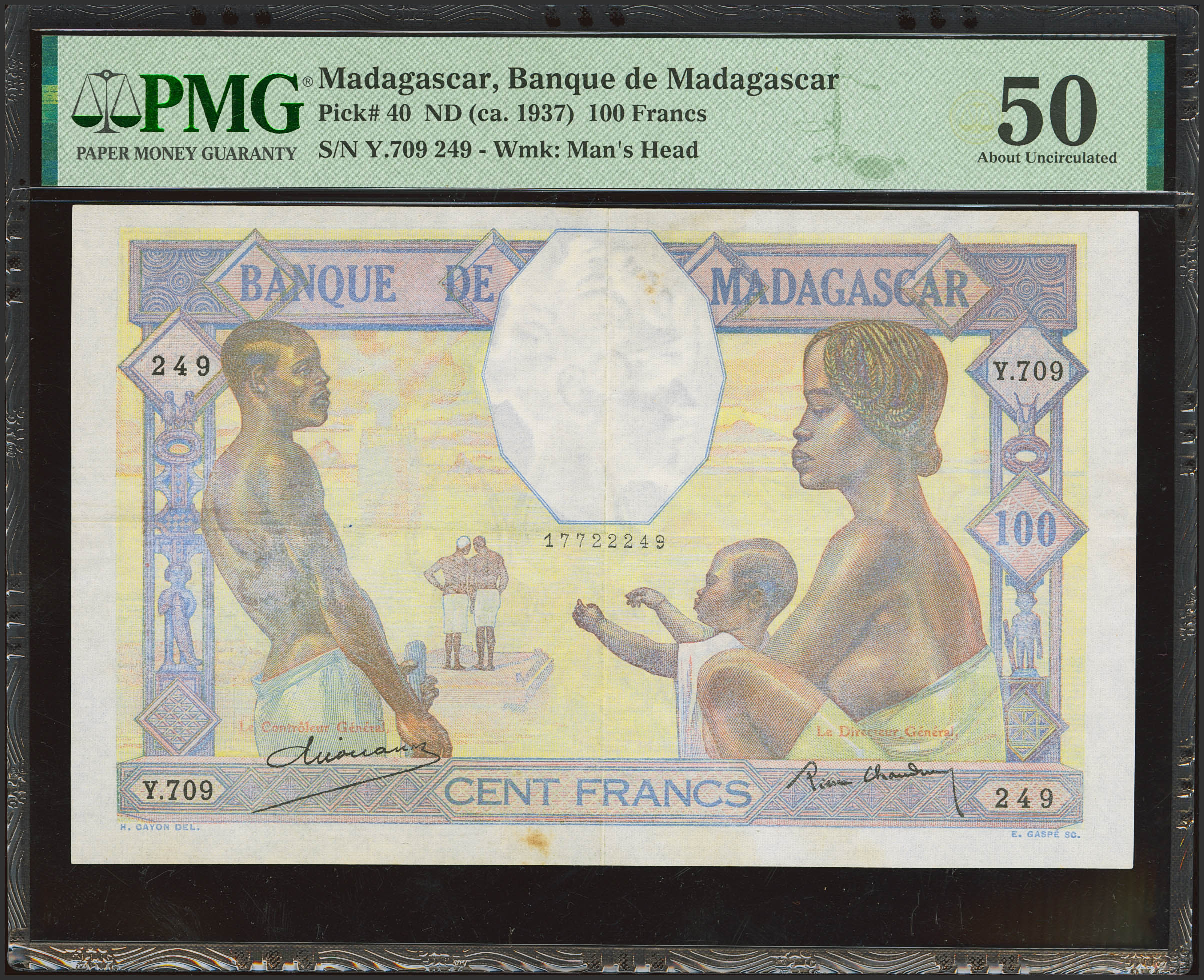 MADAGASCAR. 100 Francs. (1937ca). Banque de Madagascar. (Pick: 40). PMG50 (minor stains).