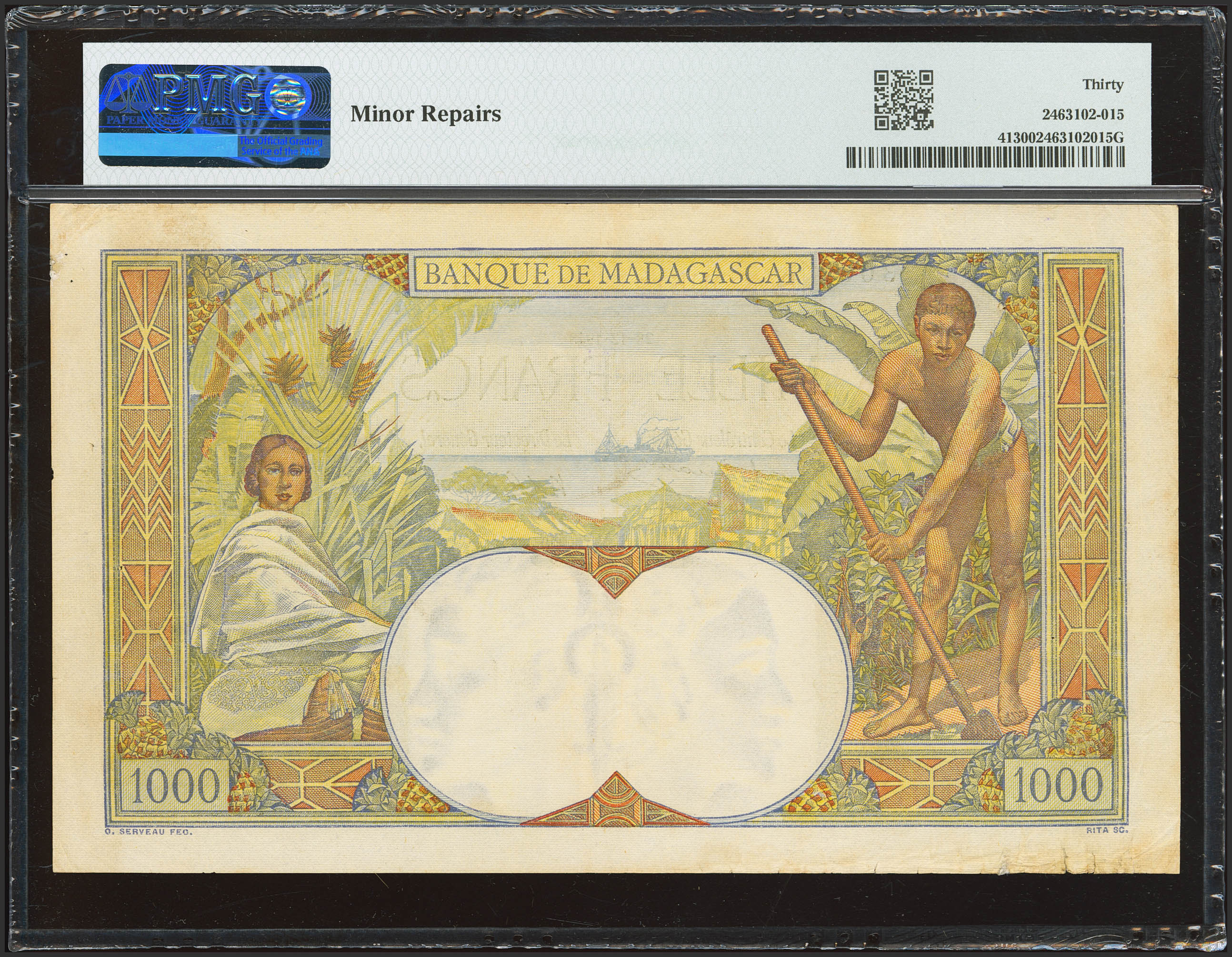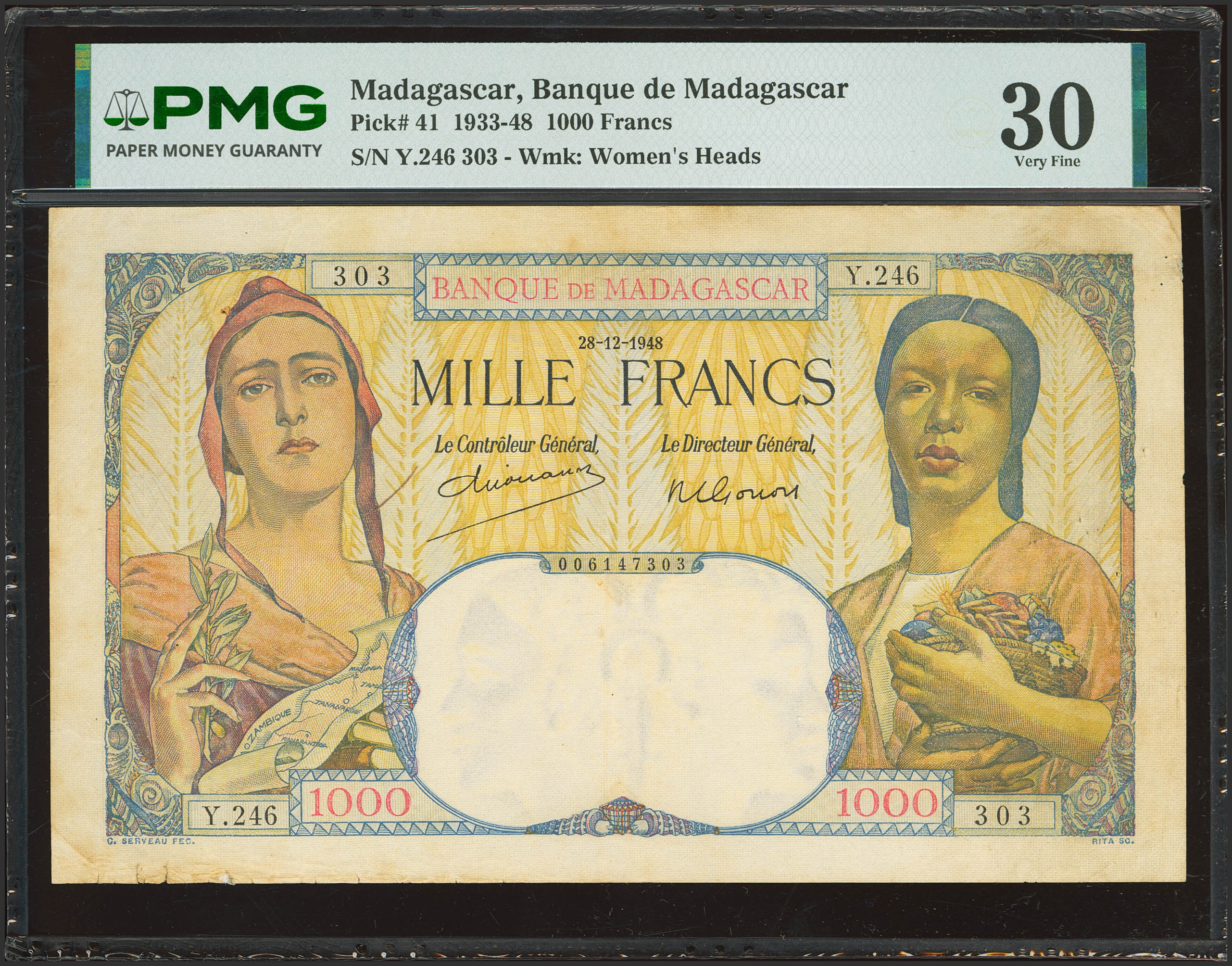 MADAGASCAR. 1000 Francs. 28 December 1948. Banque de Madagascar. (Pick: 41). PMG30 (minor repairs).