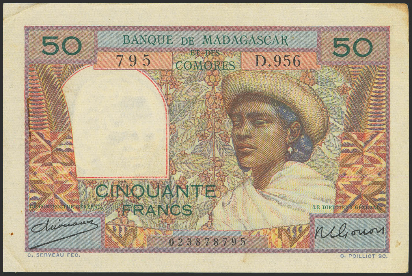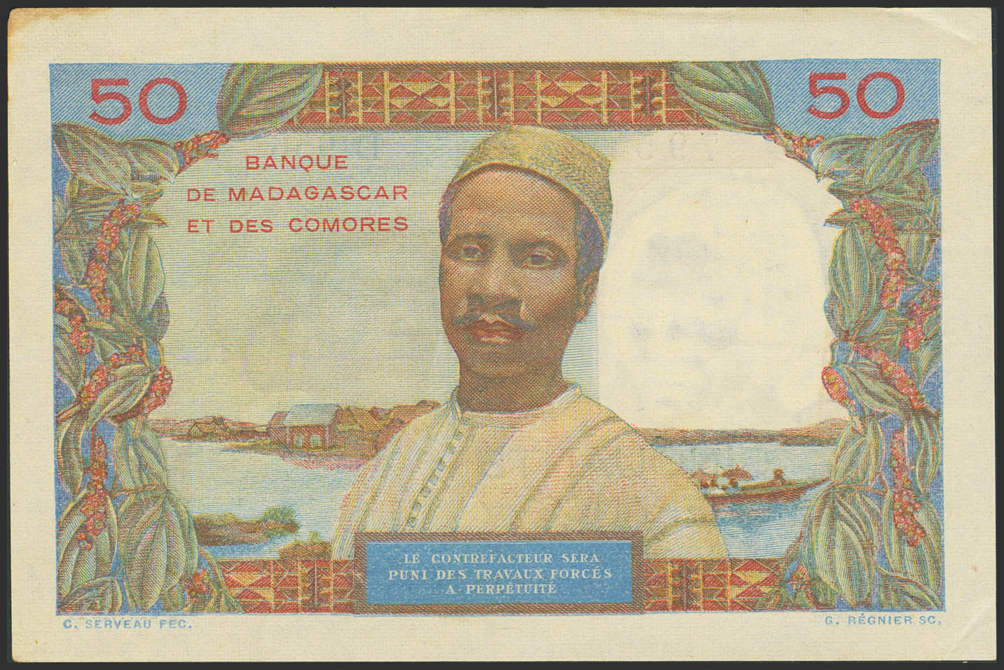 MADAGASCAR. 50 Francs. (1950ca). Banque de Madagascar et des Comores. (Pick: 45a). No center fold. Almost Uncirculated.