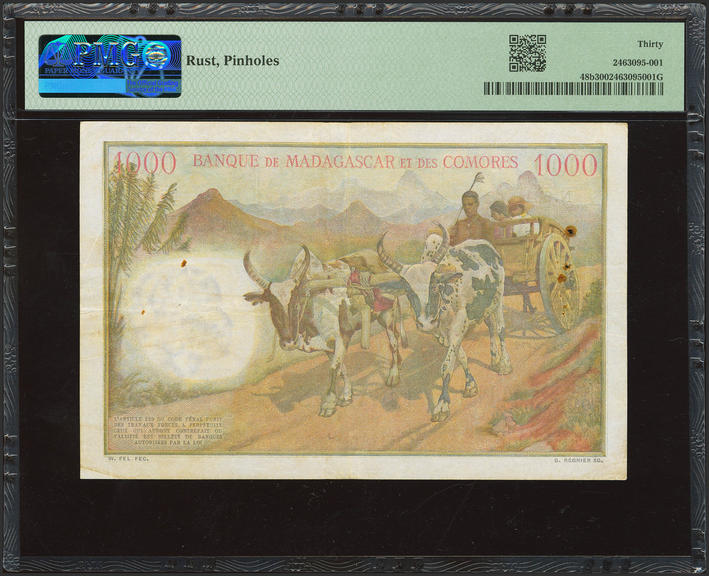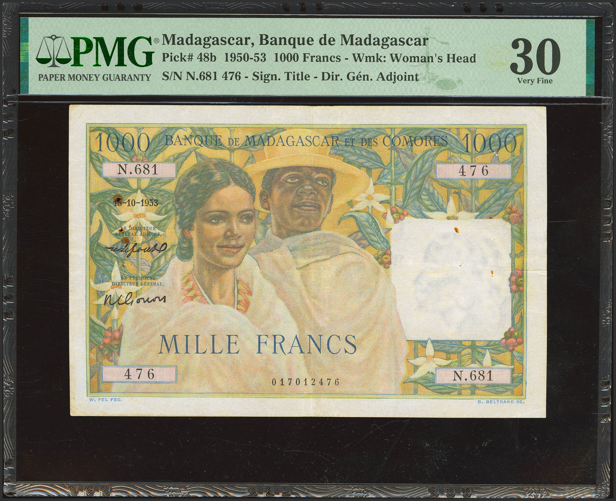 MADAGASCAR. 1000 Francs. 15 October 1953. Banque de Madagascar et des Comores. (Pick: 48). PMG30 (rust, pinholes).