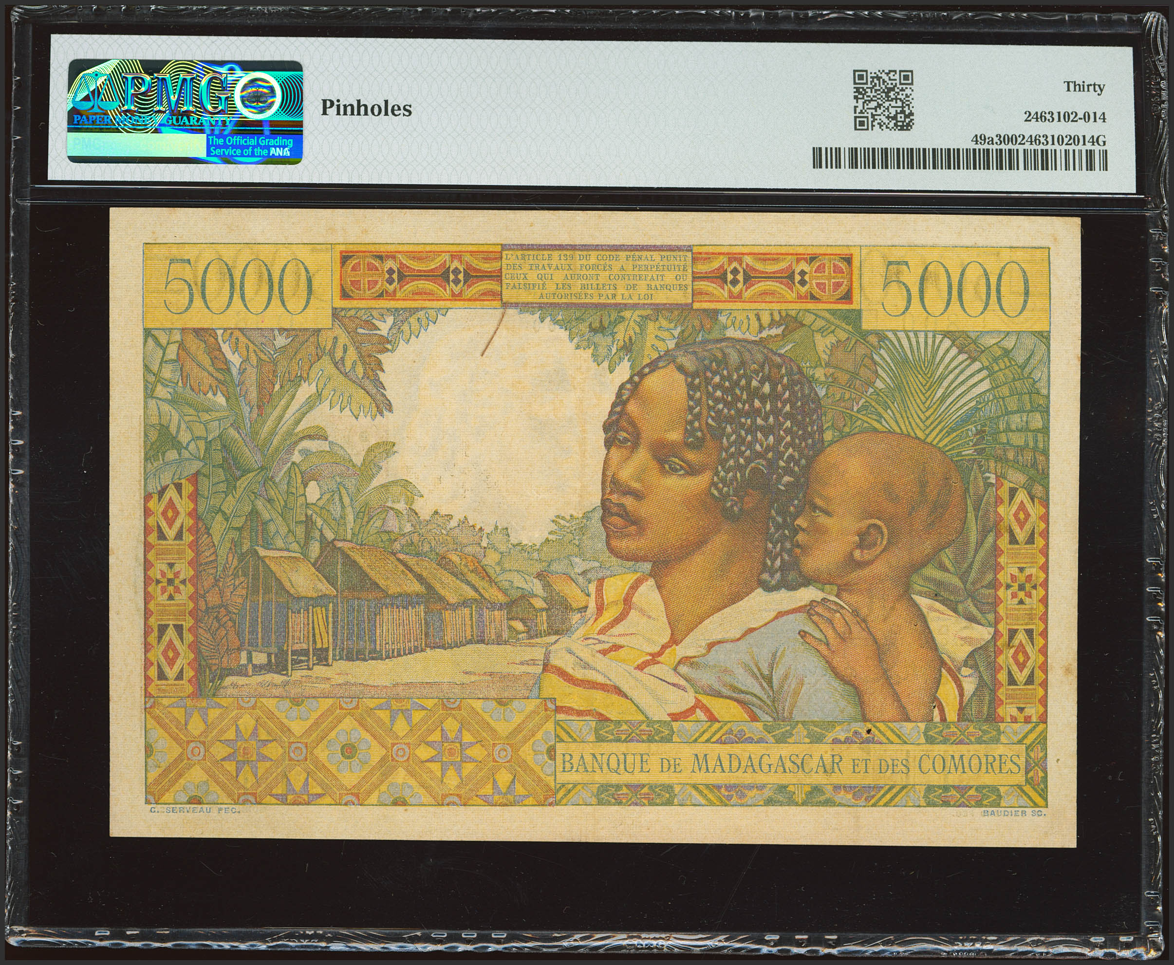 MADAGASCAR. 5000 Francs. 30 June 1950. Banque de Madagascar et des Comores. (Pick: 49a). PMG30 (pinholes).