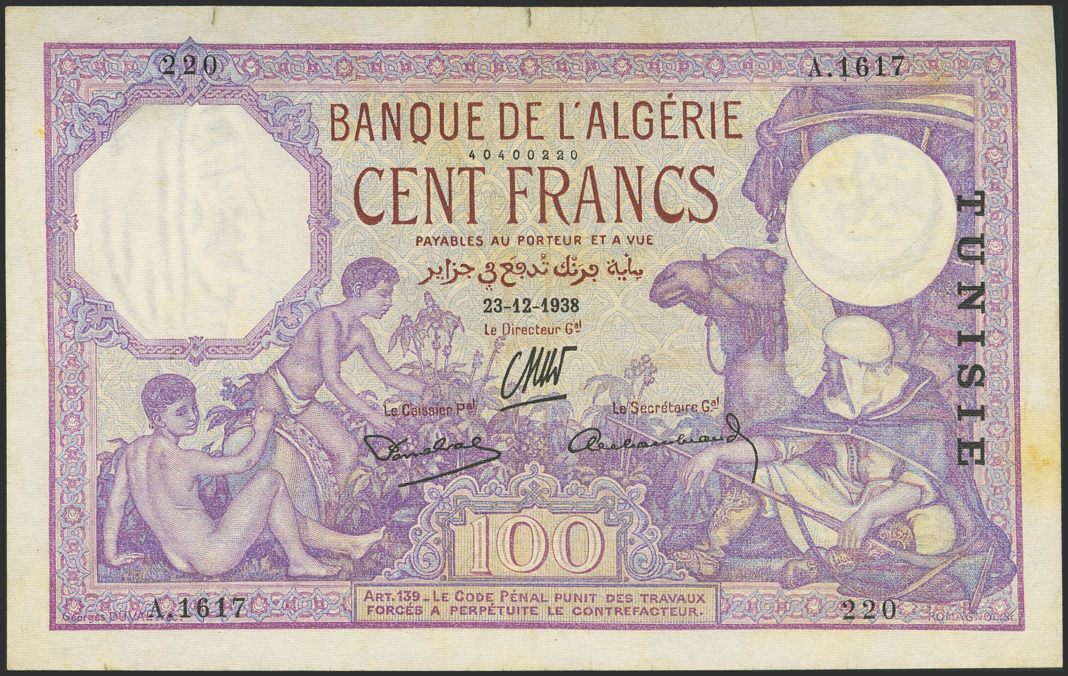 ALGERIA. 100 Francs. 23 December 1938. Banque de l'Algerie. (Pick: 81b). Restored, tape added over tears, washed and pressed. Very Fine.