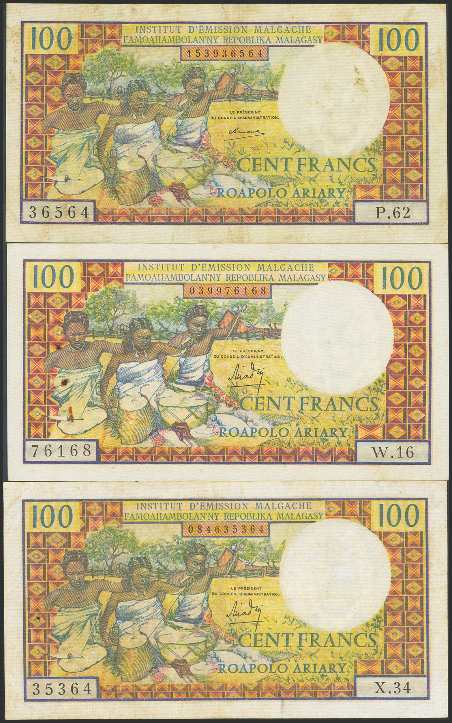 MADAGASCAR. Lot of 3 notes of 100 Francs. (1966ca). Institut d'Emission Malgache. (Pick: 57a). Very Fine to More than Extremely Fine with staple holes.