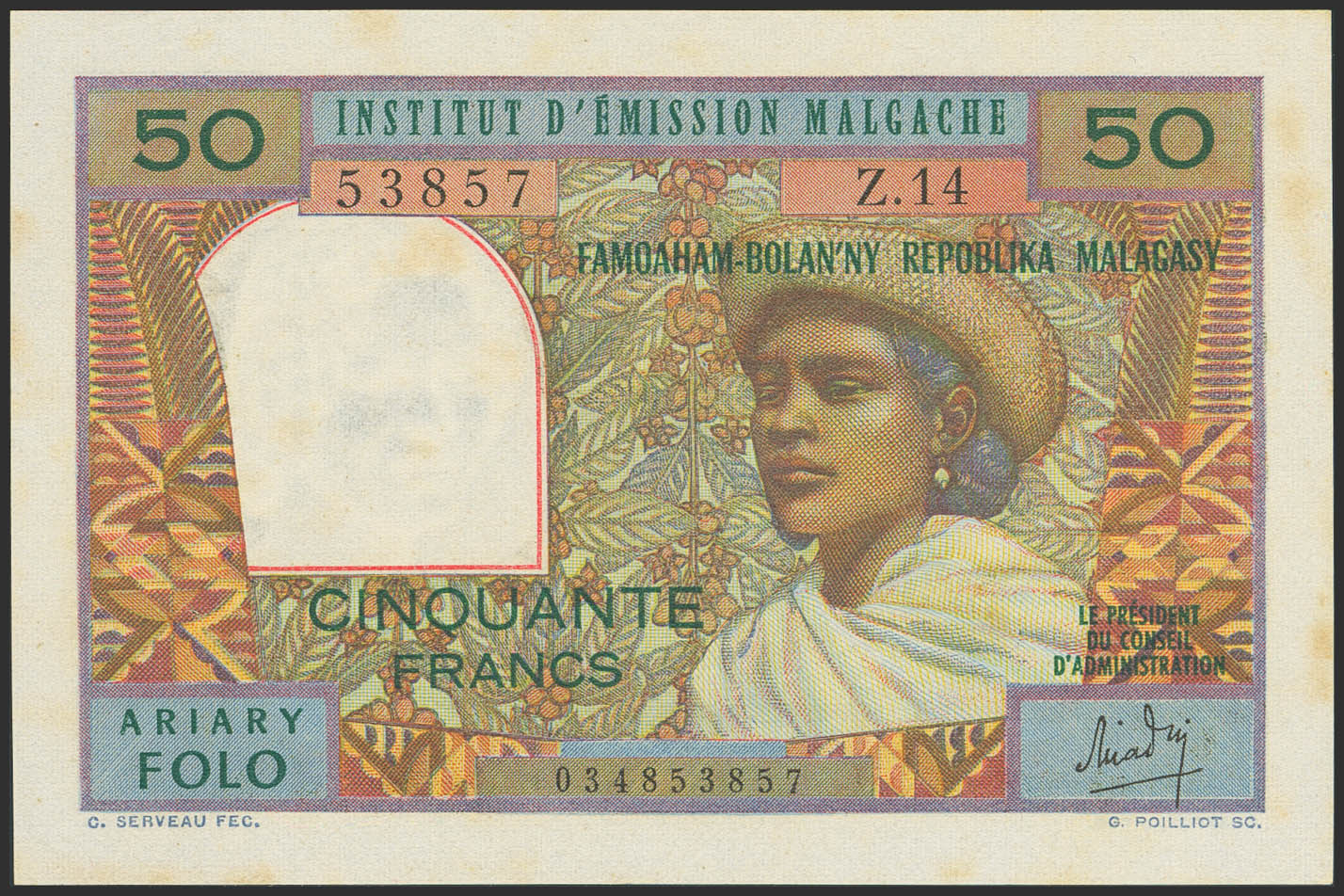 MADAGASCAR. 50 Francs. (1969ca). Institut d'Emission Malgache. (Pick: 61). Less than Uncirculated.