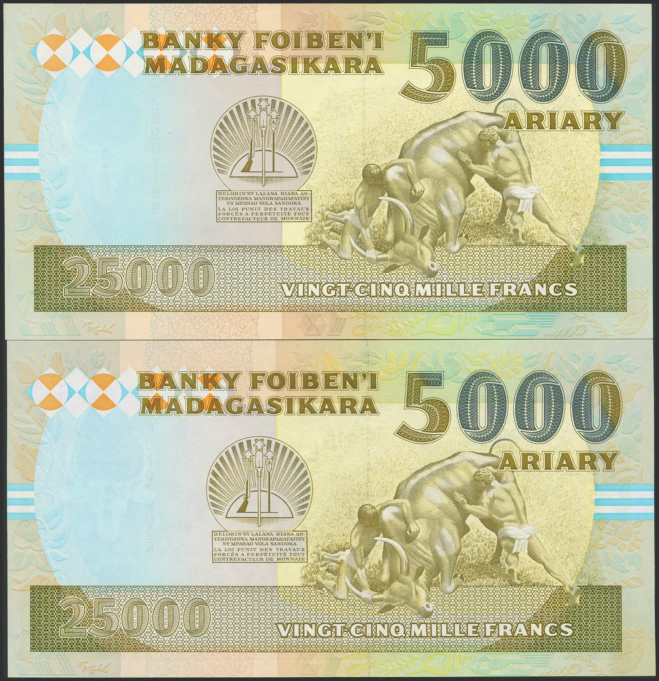 MADAGASCAR. Lot of 2 notes of 25000 Francs. (1993ca). Banky Foiben'i Madagasikara. (Pick: 74Aa, 74Ab). Uncirculated.