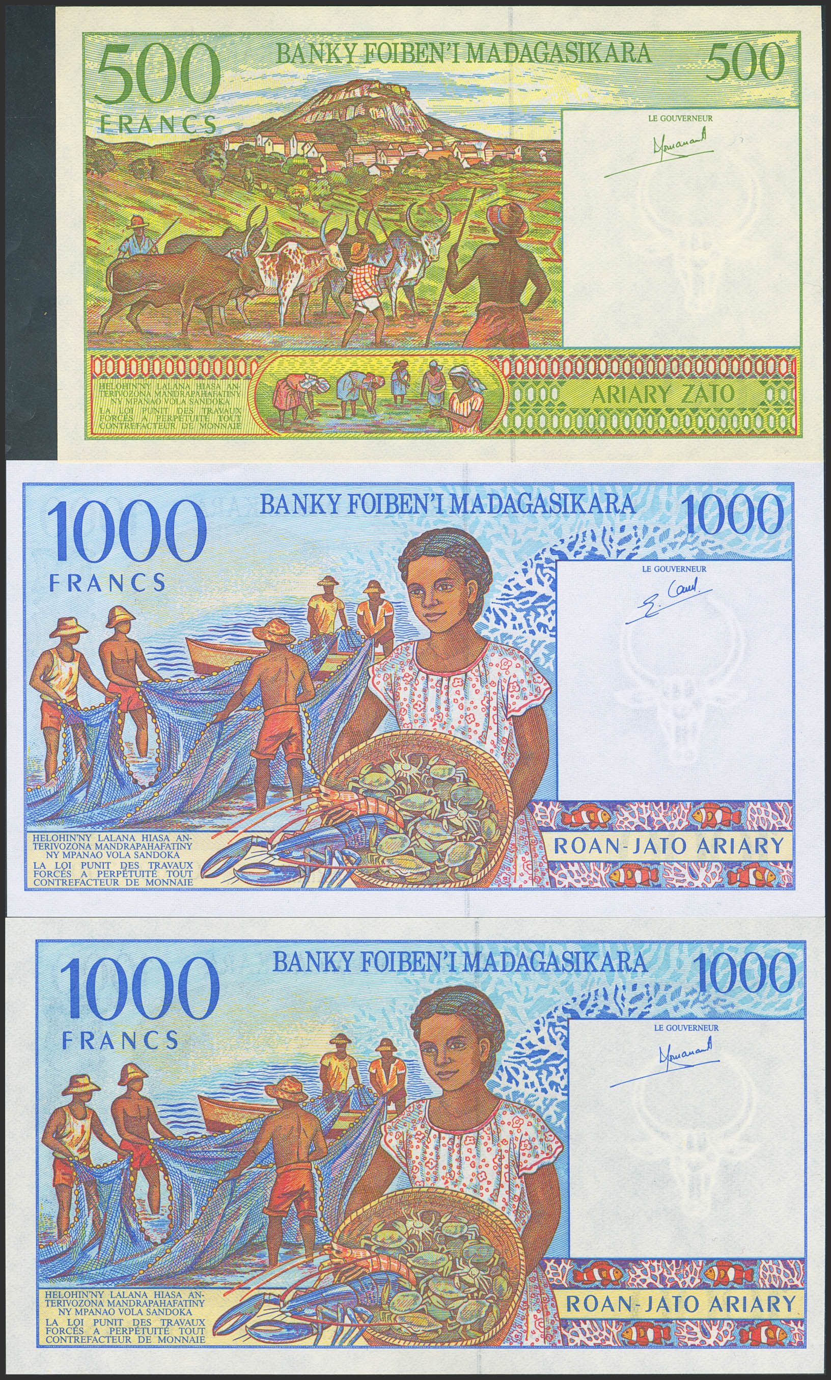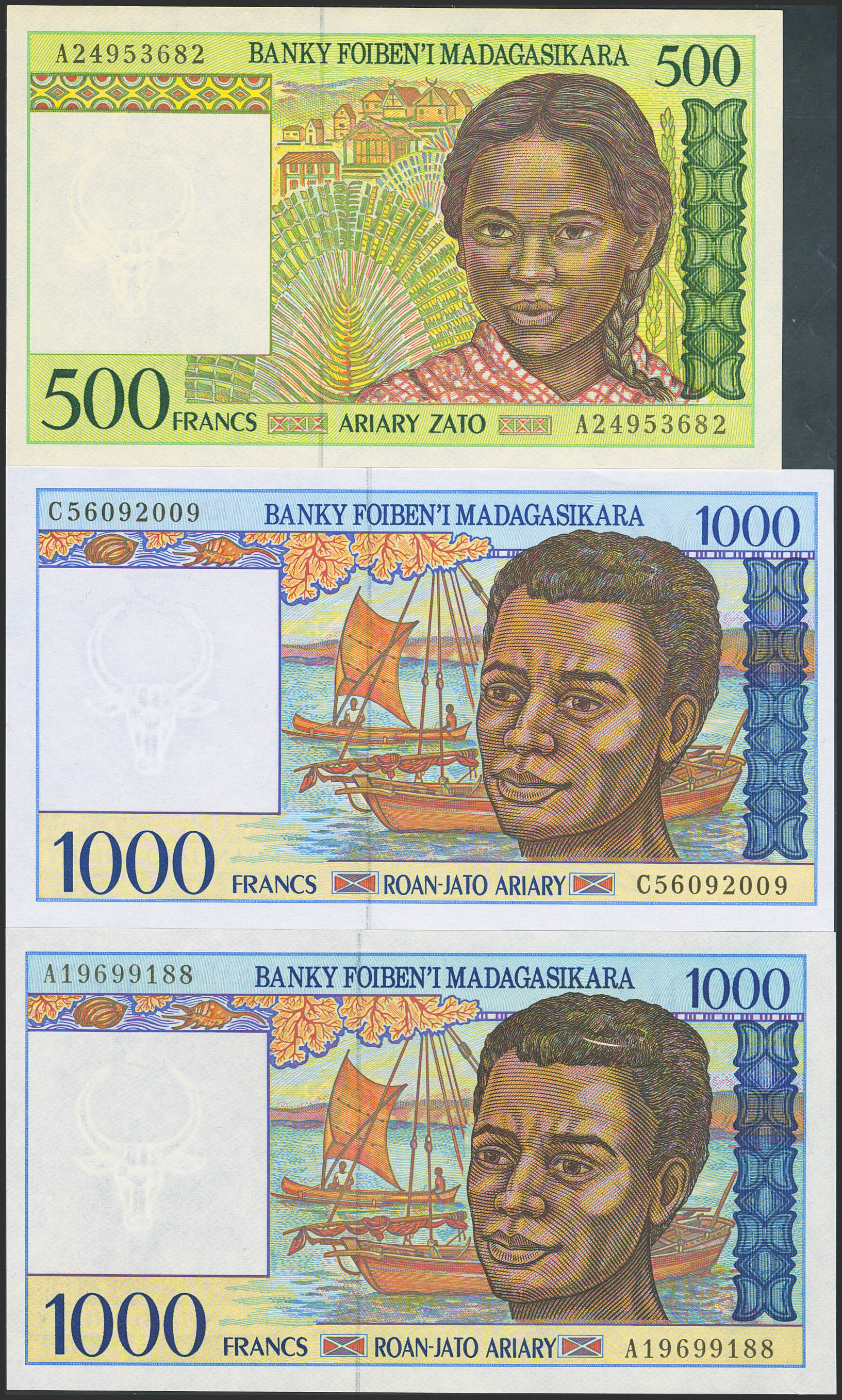 MADAGASCAR. Lot of 3 notes of 500 and 1000 Francs. (1994ca). Banky Foiben'i Madagasikara. (Pick: 75a, 76a, 76b). Uncirculated.