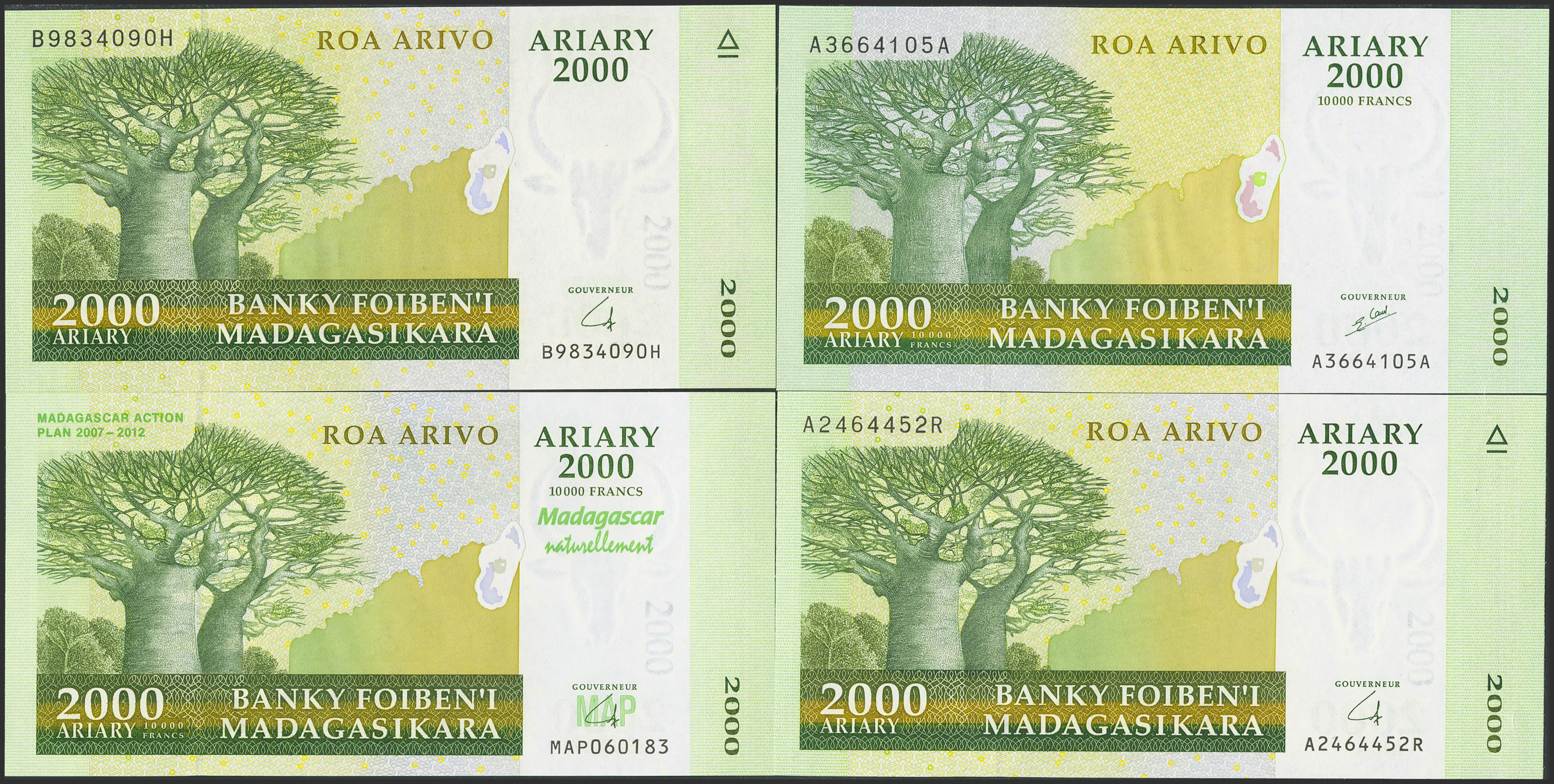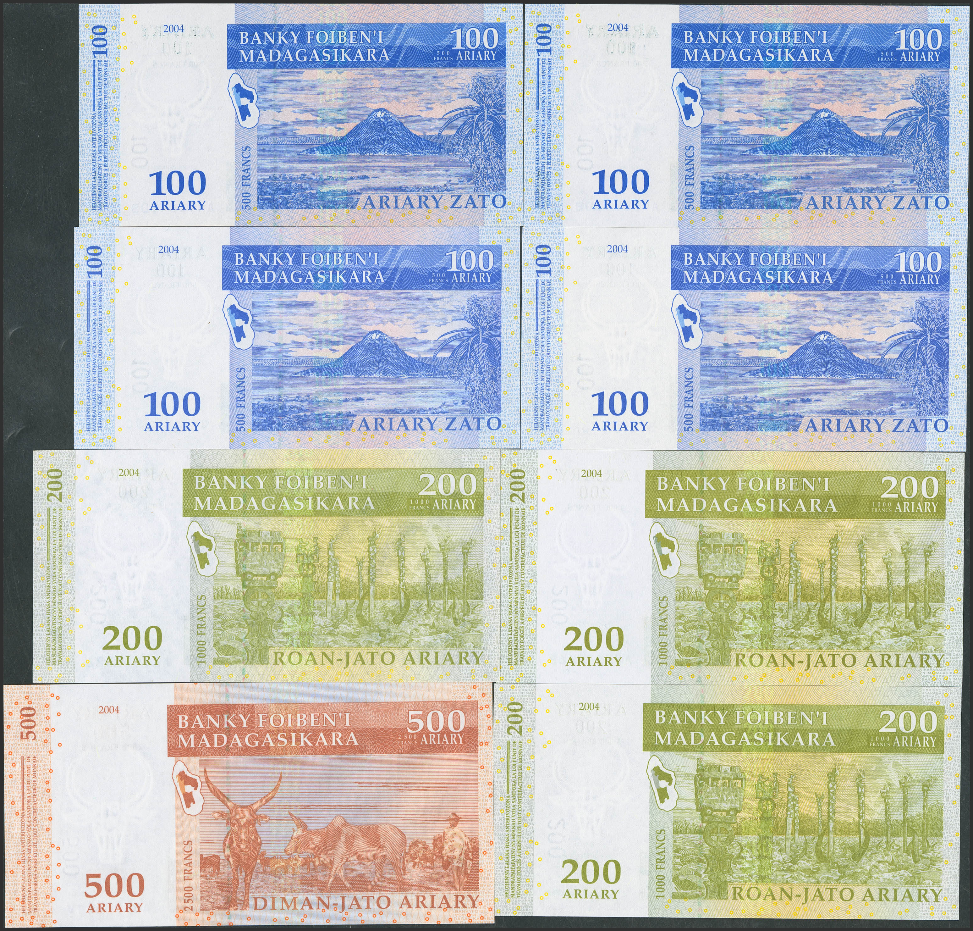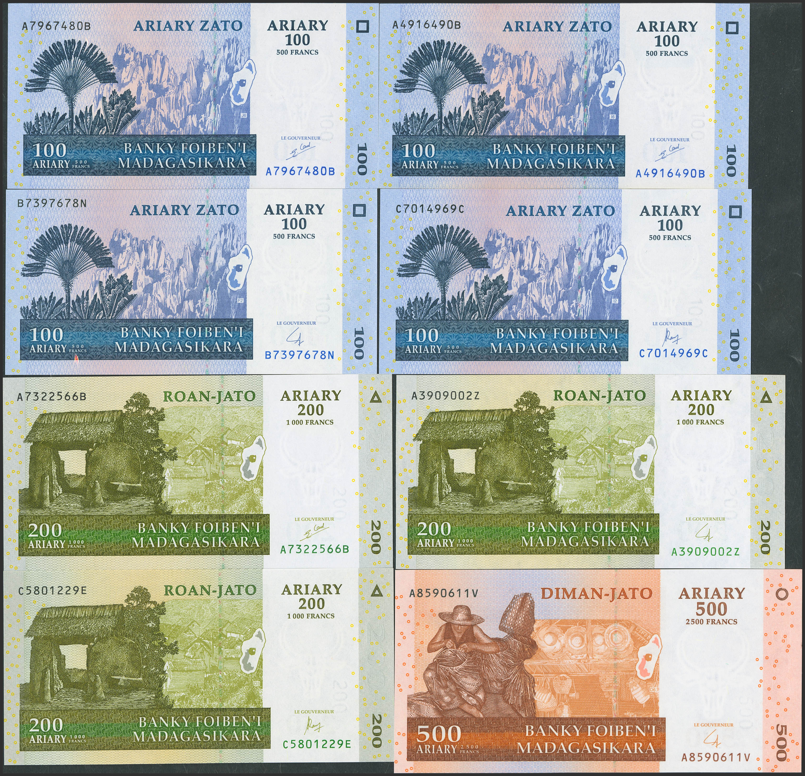 MADAGASCAR. Lot of 16 notes from 100 to 2000 Ariary. 2003 to 2007. Banky Foiben'i Madagasikara. (Pick: 83, 86a(2), 86b, 86c, 87a, 87b, 87c, 88a, 88b(2), 89a, 89b, 90b(2), 93a). Uncirculated.