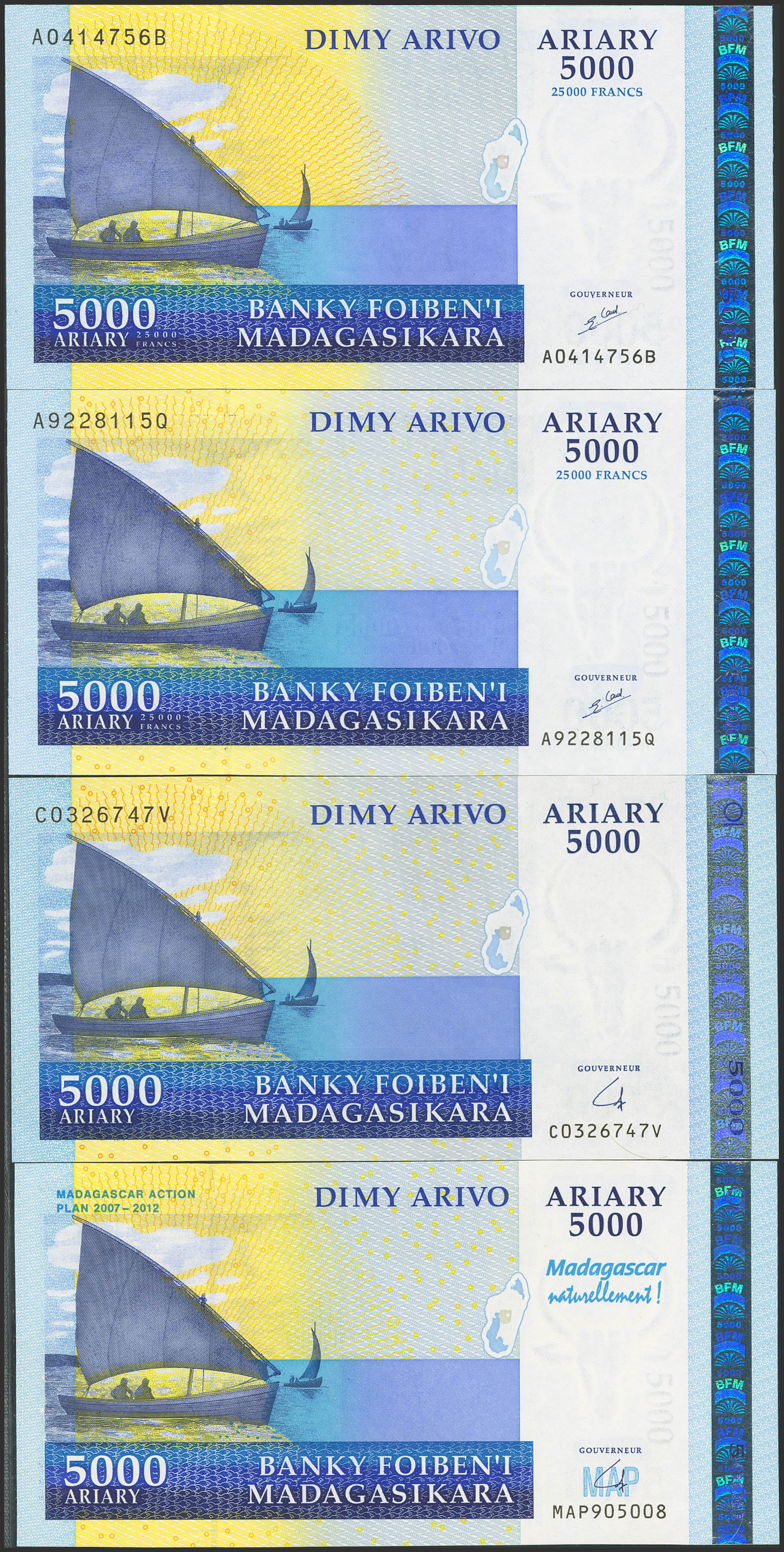 MADAGASCAR. Lot of 4 notes of 5000 Ariary. 2003 to 2007. Banky Foiben'i Madagasikara. (Pick: 84, 91a, 91b, 84a). Uncirculated.