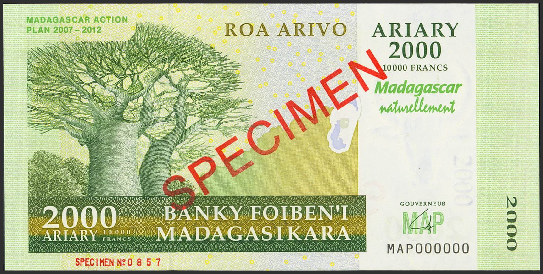 MADAGASCAR. 2000 Ariary. 2007. Banky Foiben'i Madagasikara. Specimen. (Pick: 93s). Uncirculated.