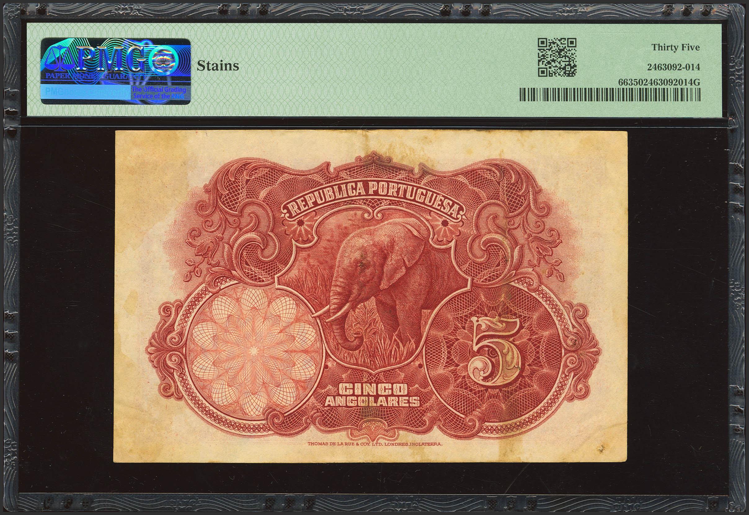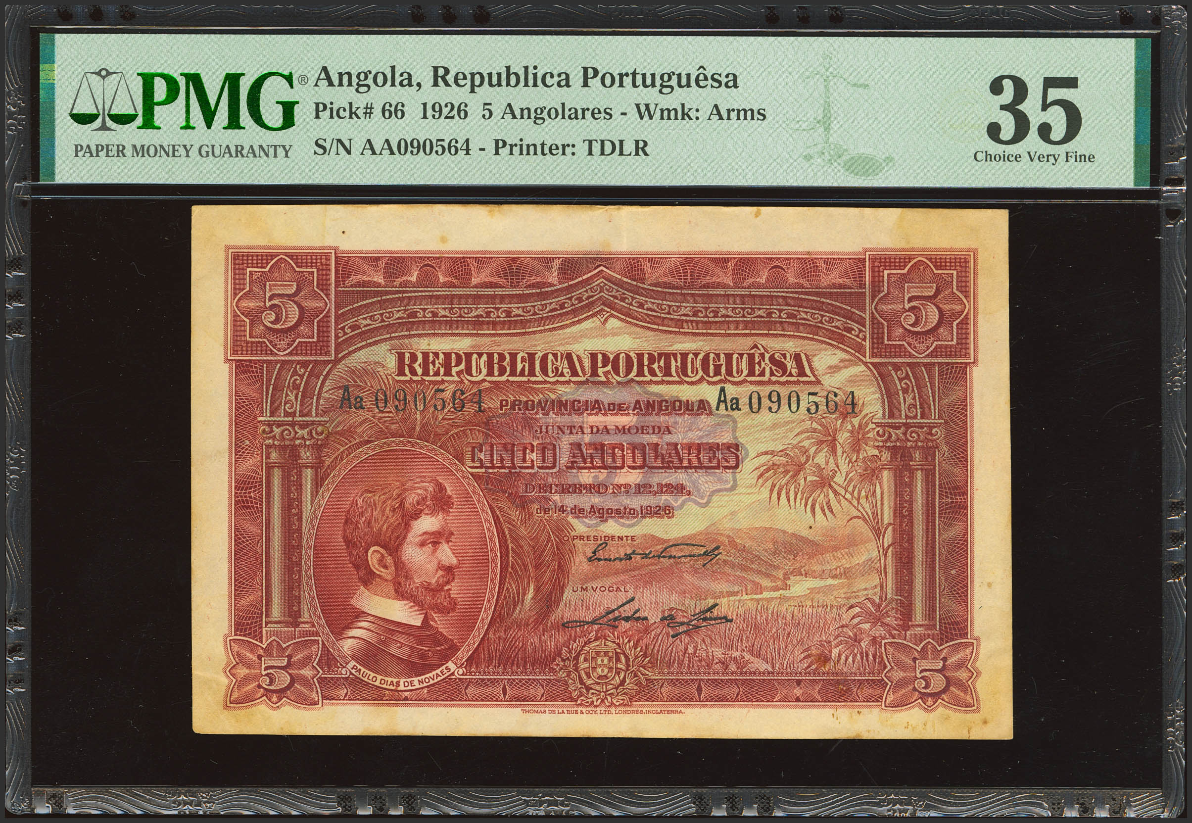 ANGOLA. 5 Angolares. 14 August 1926. Provincia de Angola. Junta da Moeda. (Pick: 66). PMG35 (stains).