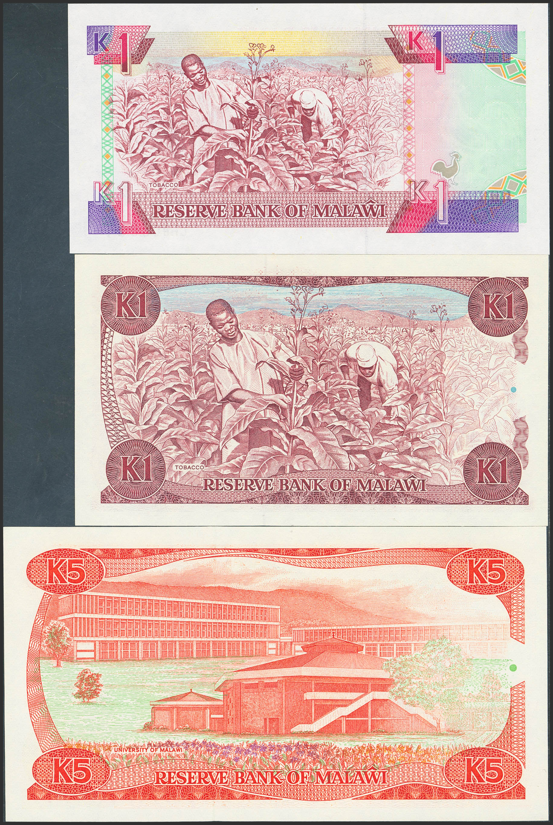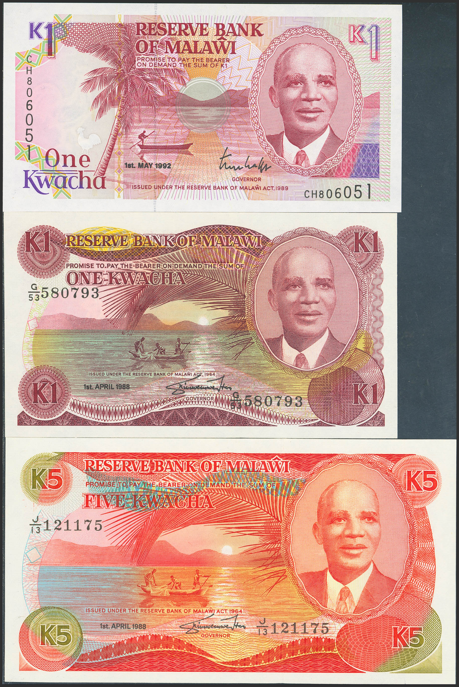 MALAWI. Lot of 3 notes of 1 and 5 Kwacha. 1988 and 1992. Reserve Bank. (Pick: 19b, 20b, 23b). Uncirculated.