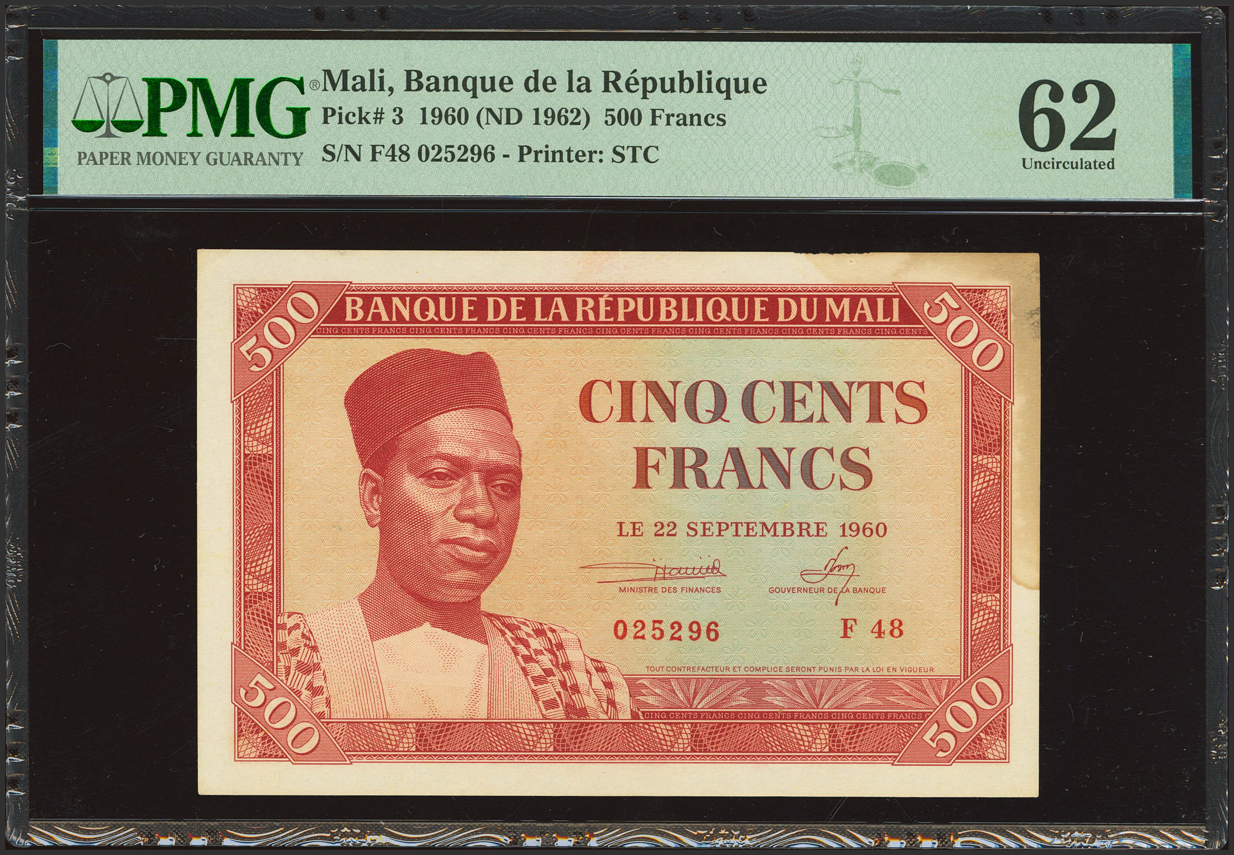 MALI. 500 Francs. 22 September 1960. Banque de la Republique. (Pick: 3). PMG62 (stain).