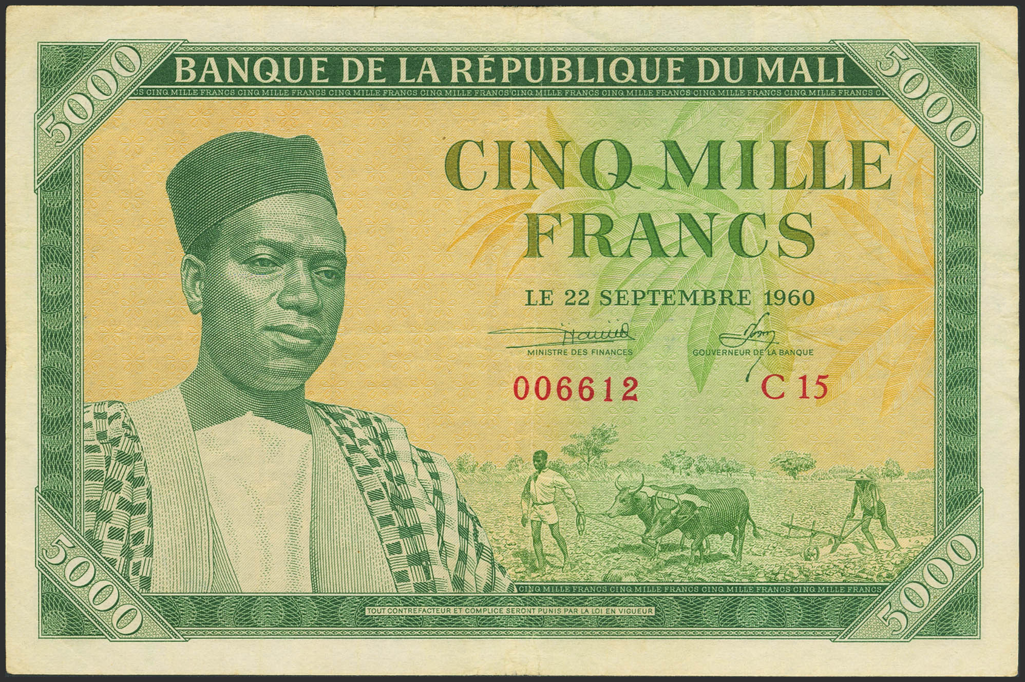 MALI. 5000 Francs. 22 September 1960. Banque de la Republique. (Pick: 5). More than Very Fine.