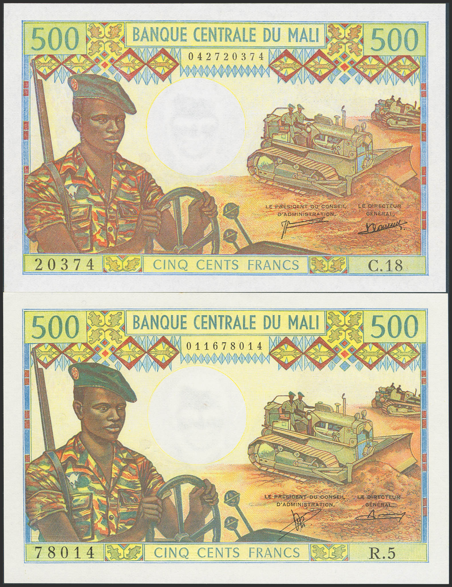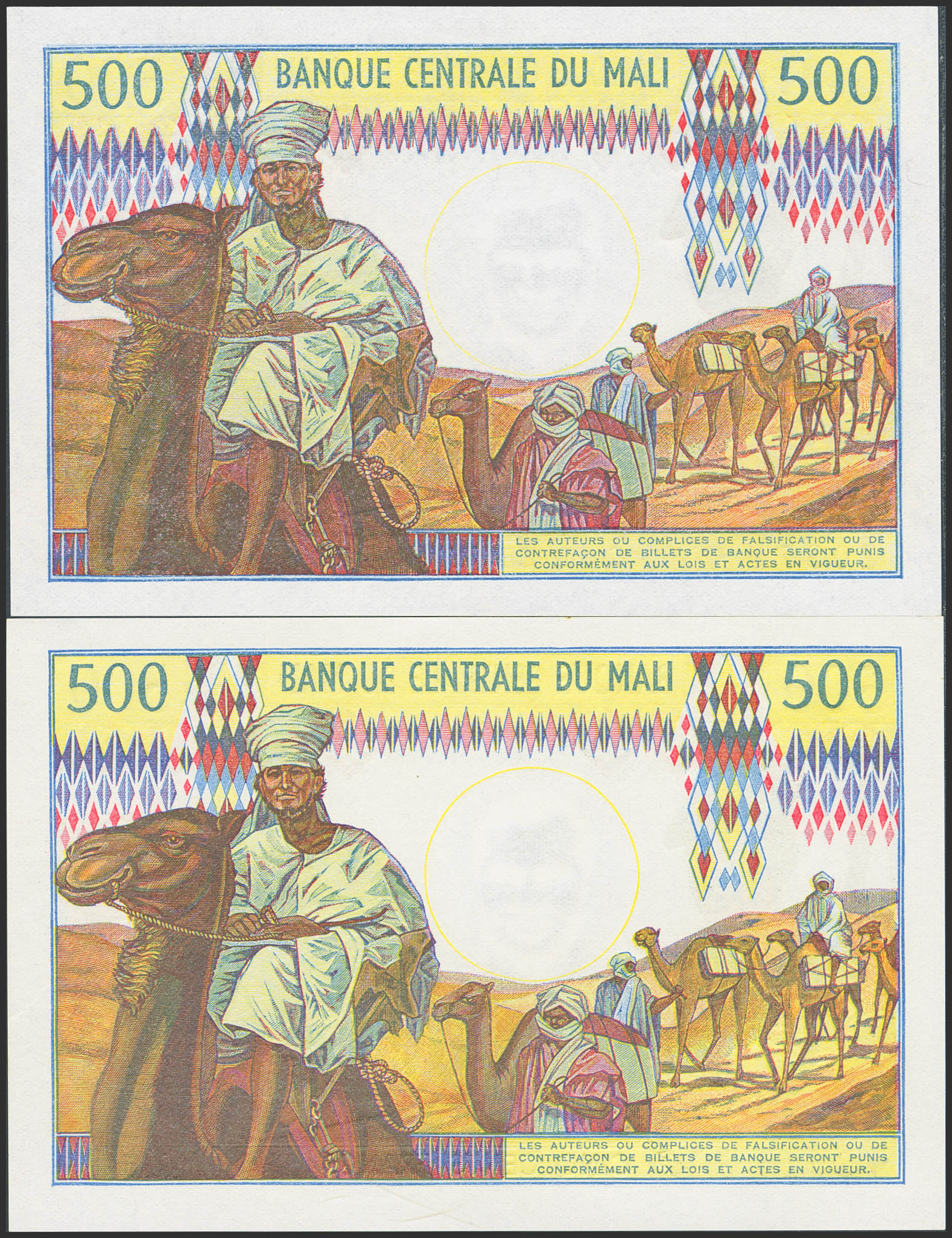 MALI. Lot of 2 notes of 500 Francs. (1973ca). Banque Centrale. (Pick: 12b, 12d). Uncirculated and Less than Uncirculated.