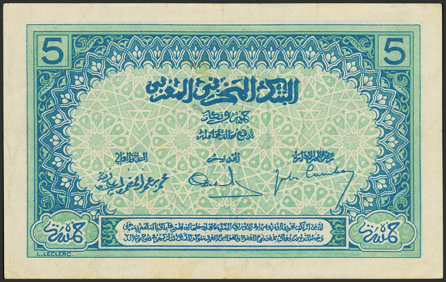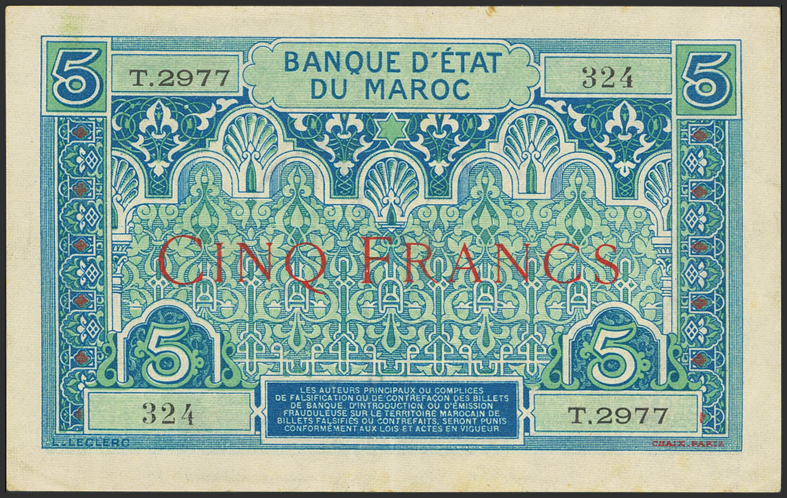 MOROCCO. 5 Francs. (1924ca). Banque d'Etat du Maroc. (Pick: 9). Extremely Fine.
