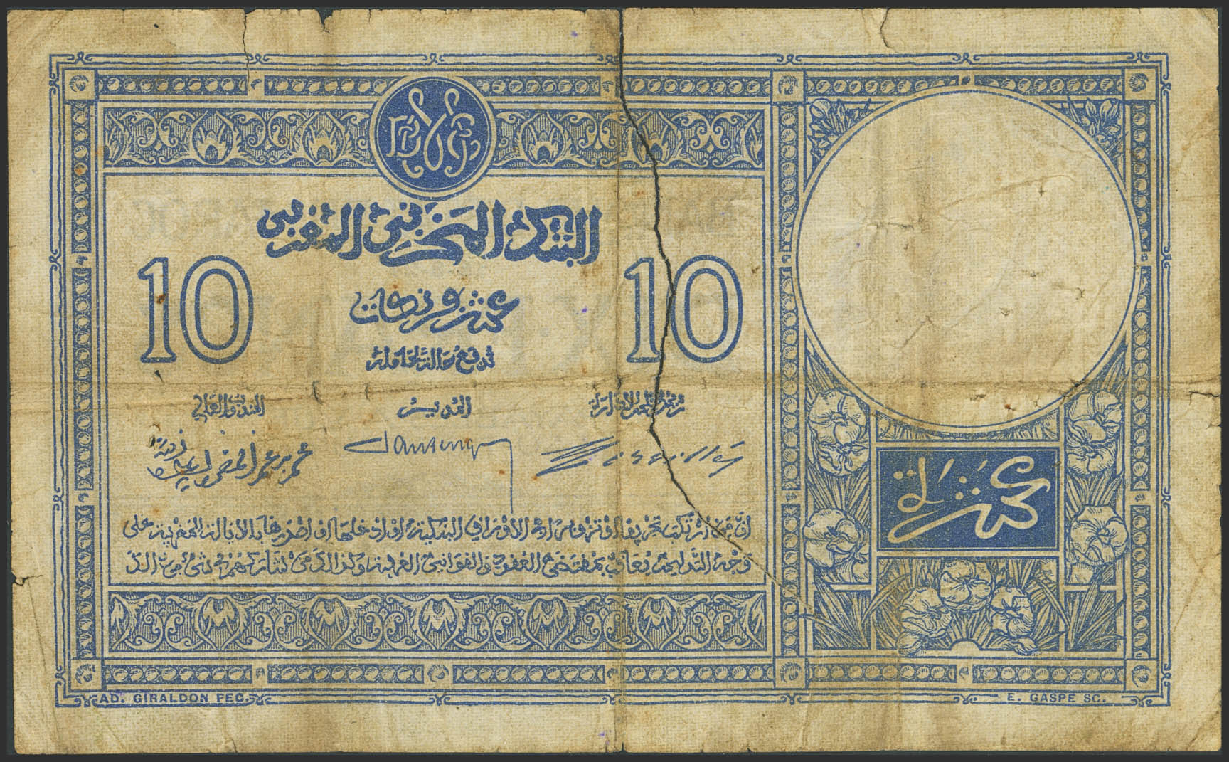 MOROCCO. 10 Francs. 18 August 1924. Banque d'Etat du Maroc. (Pick: 11b). Tears. Fine.