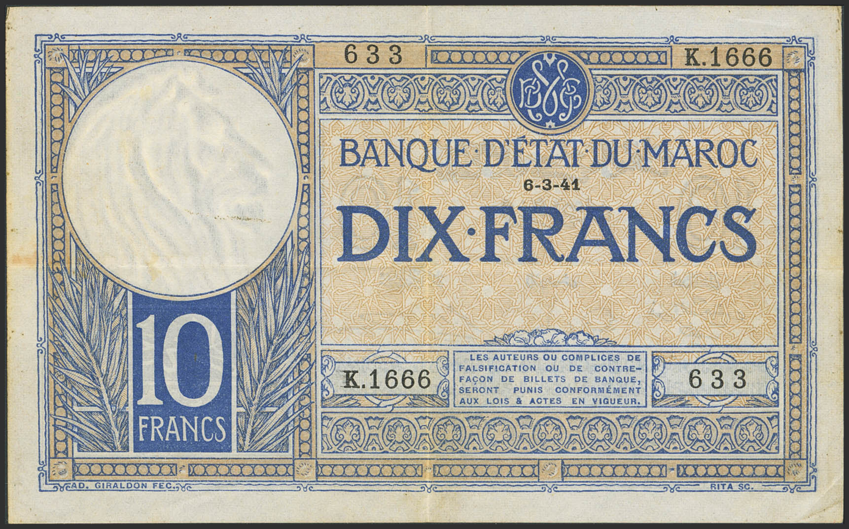 MOROCCO. 10 Francs. 6 March 1941. Banque d'Etat du Maroc. (Pick: 17b). Dirty. Extremely Fine.