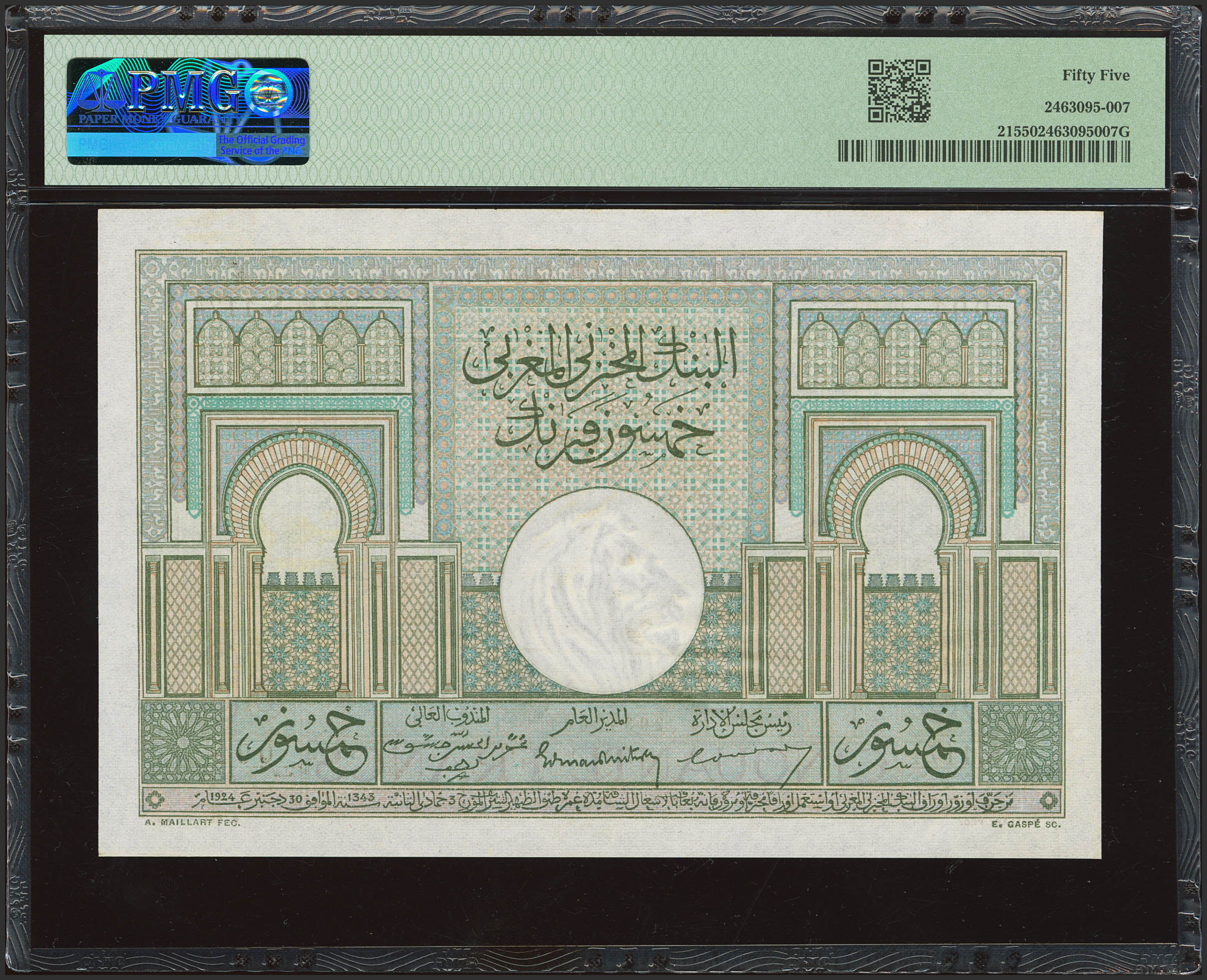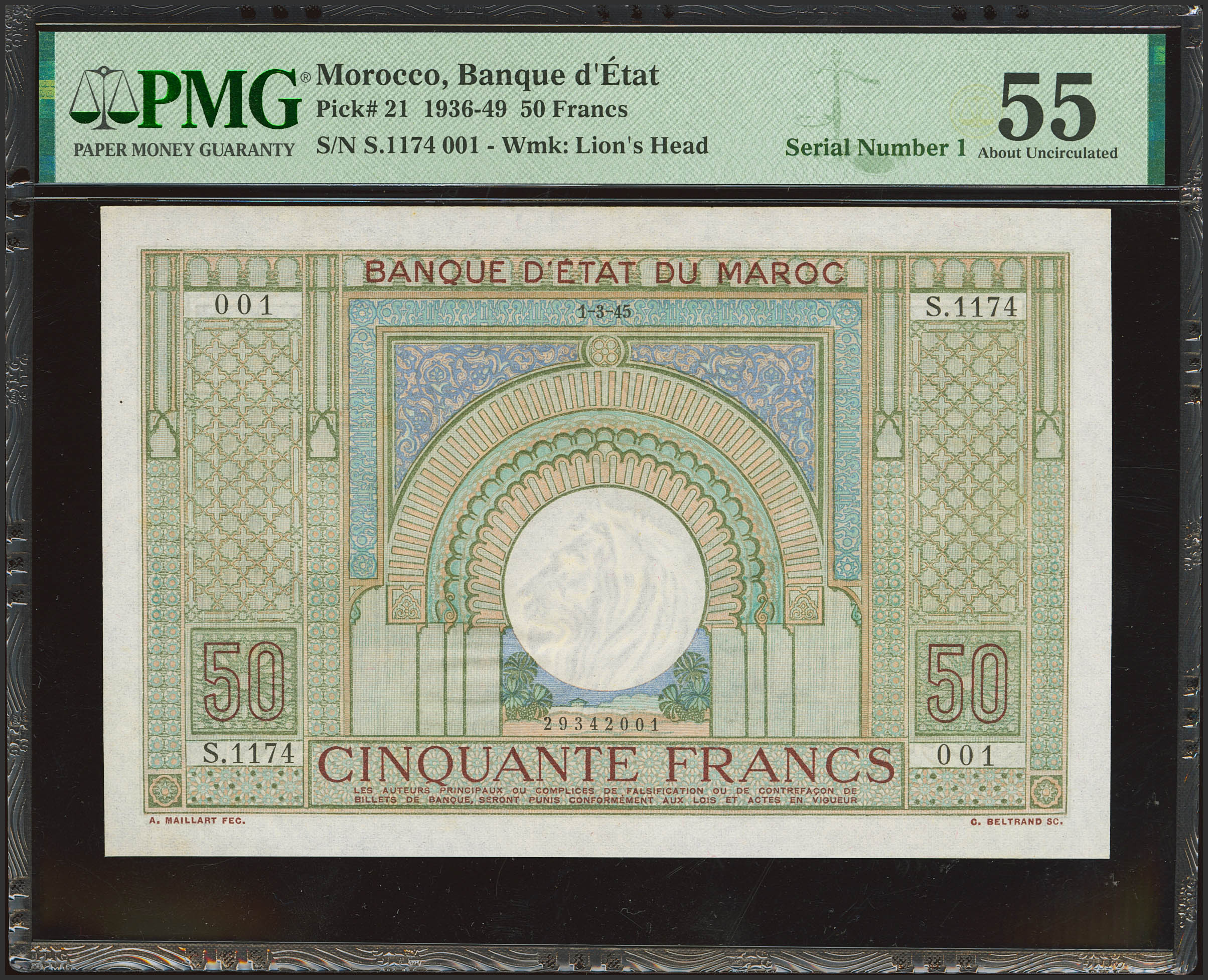 MOROCCO. 50 Francs. 1 March 1945. Banque d'Etat du Maroc. Serial number 1. (Pick: 21). PMG55.