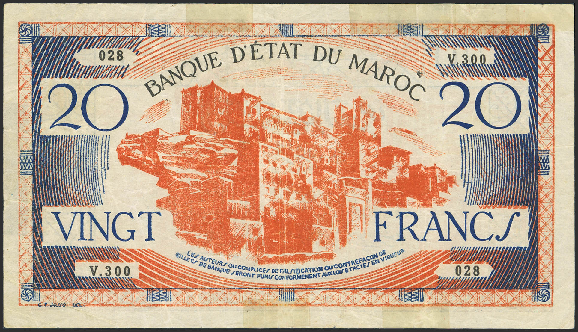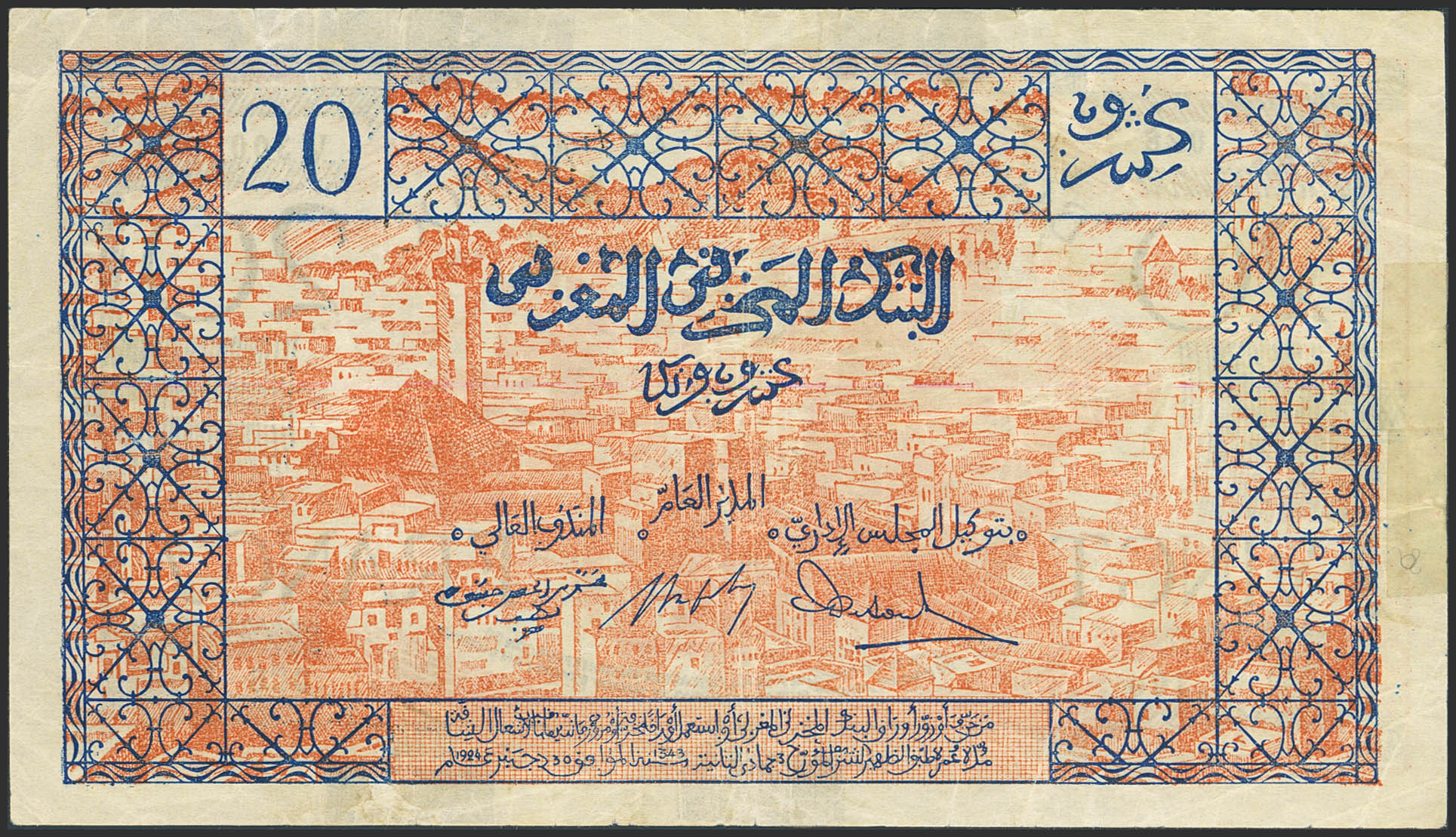 MOROCCO. 20 Francs. (1943ca). Banque d'Etat du Maroc. (Pick: 39). Added tape on the edges. Very Fine.