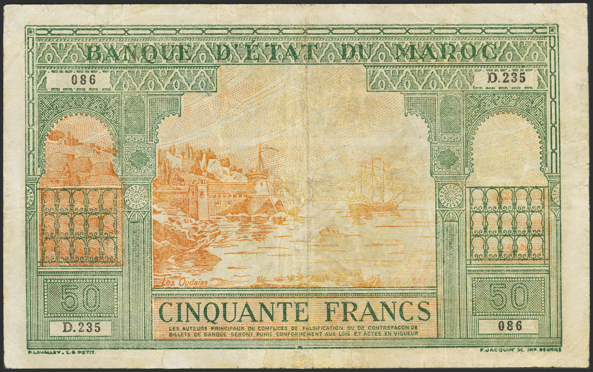 MOROCCO. 50 Francs. (1943ca). Banque d'Etat du Maroc. (Pick: 40). Restored. Fine.