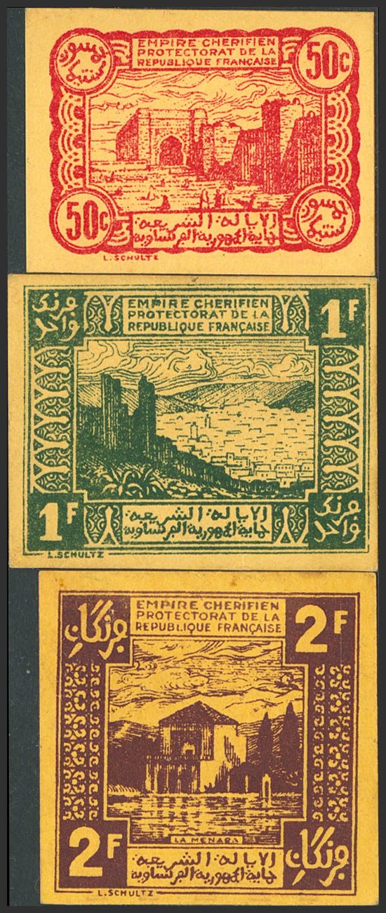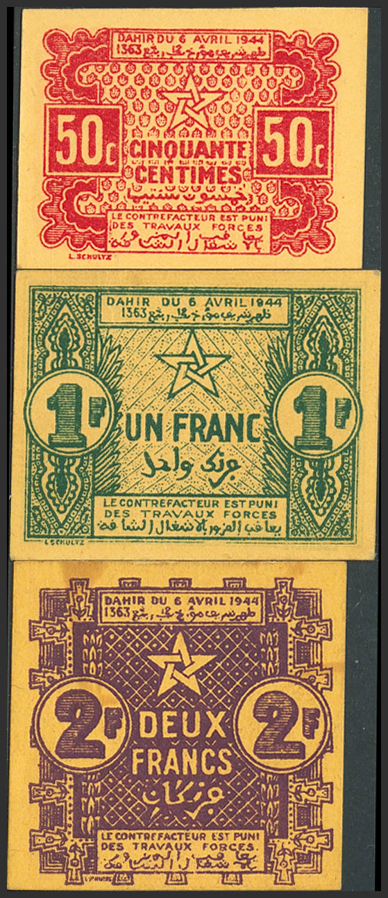 MOROCCO. Complete set of 3 notes from 50 Centimes to 2 Francs. 6 April 1944. Empire Cherifien. (Pick: 41, 42, 43). Uncirculated (2) and Almost Uncirculated (1).