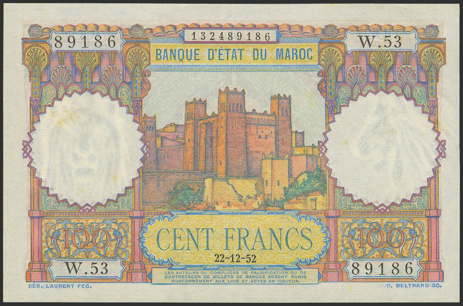 MOROCCO. 100 Francs. 22 December 1952. Banque d'Etat du Maroc. (Pick: 45). More than Extremely Fine.