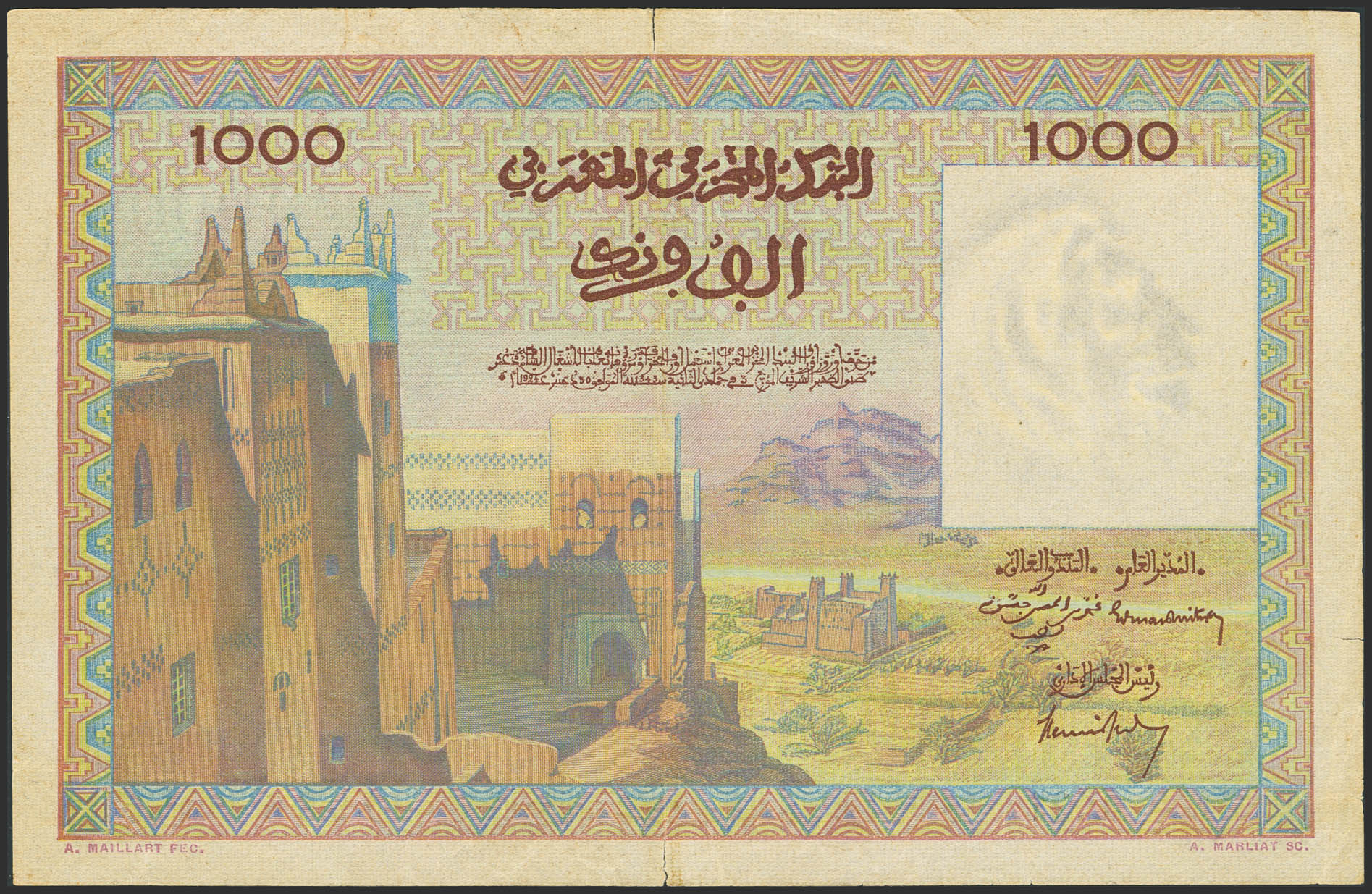 MOROCCO. 1000 Francs. 15 November 1956. Banque d'Etat du Maroc. (Pick: 47). Tear at the ends of the central fold. More than Extremely Fine.