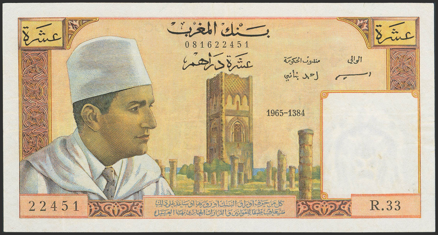 MOROCCO. 10 Dirhams. 1965. Banque du Maroc. (Pick: 54c). More than Very Fine.