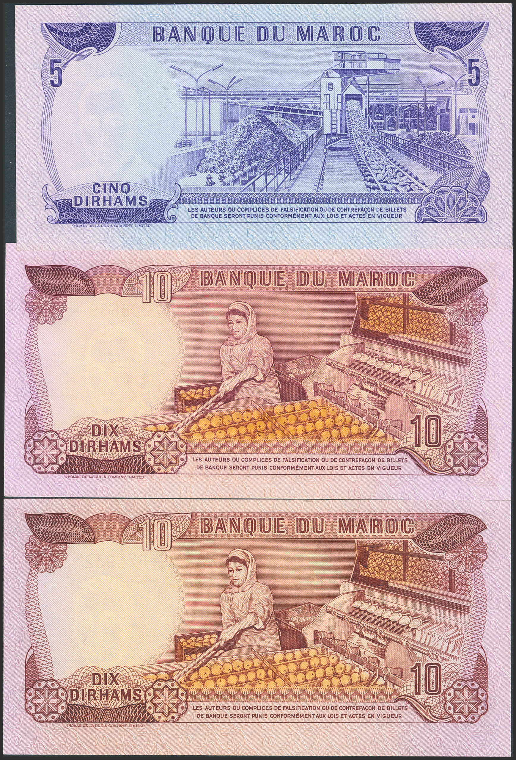 MOROCCO. Lot of 3 notes of 5 and 10 Dirhams. 1970 and 1985. Banque du Maroc. (Pick: 56a, 57a, 57b). Uncirculated.