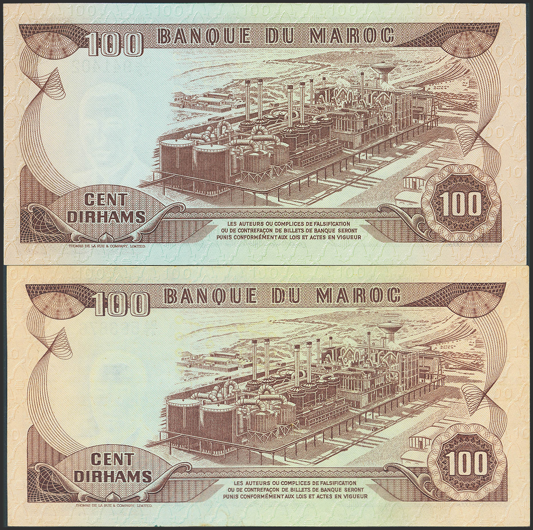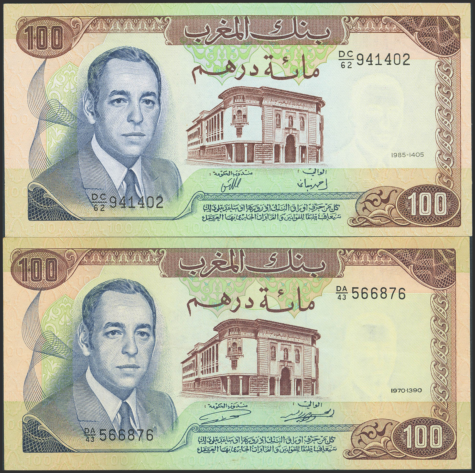 MOROCCO. Lot of 2 notes of 100 Dirhams. 1970 and 1985. Banque du Maroc. (Pick: 59a, 59b). More than Extremely Fine and Uncirculated.
