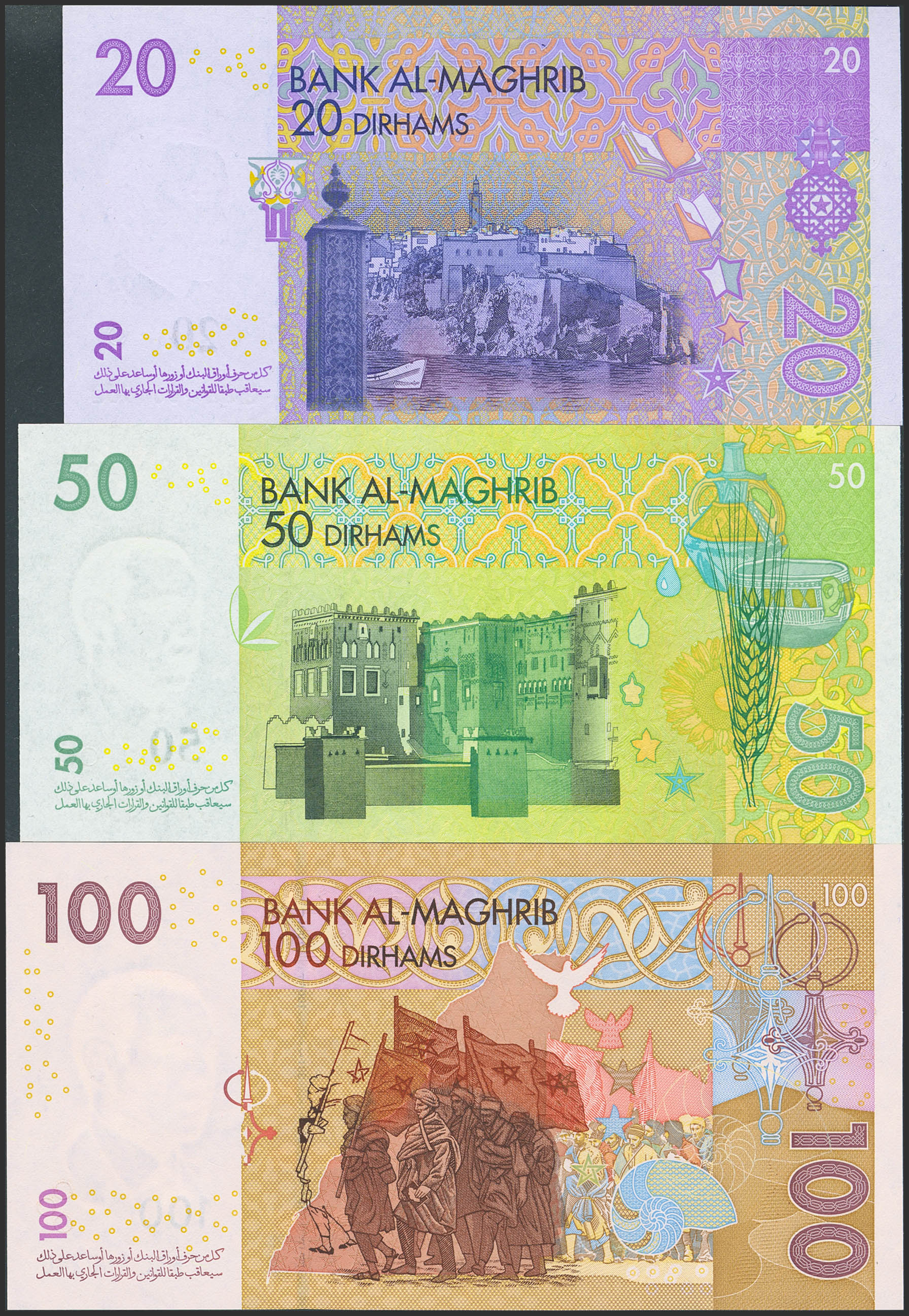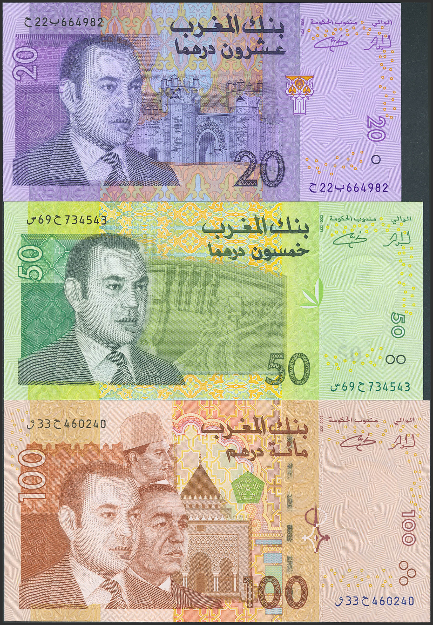 MOROCCO. Lot of 3 notes from 20 to 100 Dirhams. 2005. Bank Al-Maghrib. (Pick: 68, 69a, 70). Uncirculated.
