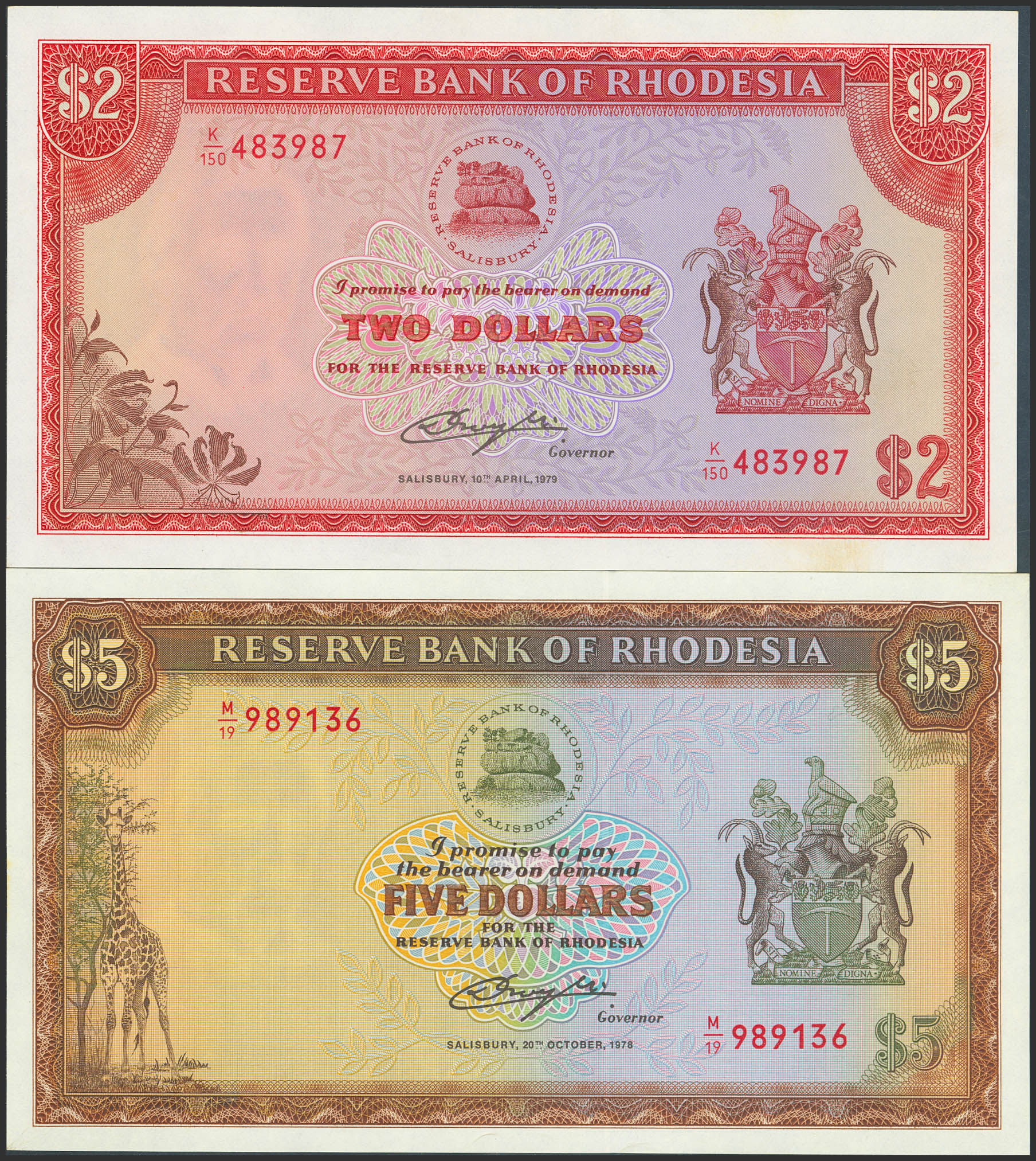 RHODESIA. Lot of 2 notes of 2 and 5 Dollars. 1978 and 1979. Reserve Bank. Watermark Cecil Rhodes. (Pick: 35d, 36b). Less than Uncirculated and Uncirculated (P36b).