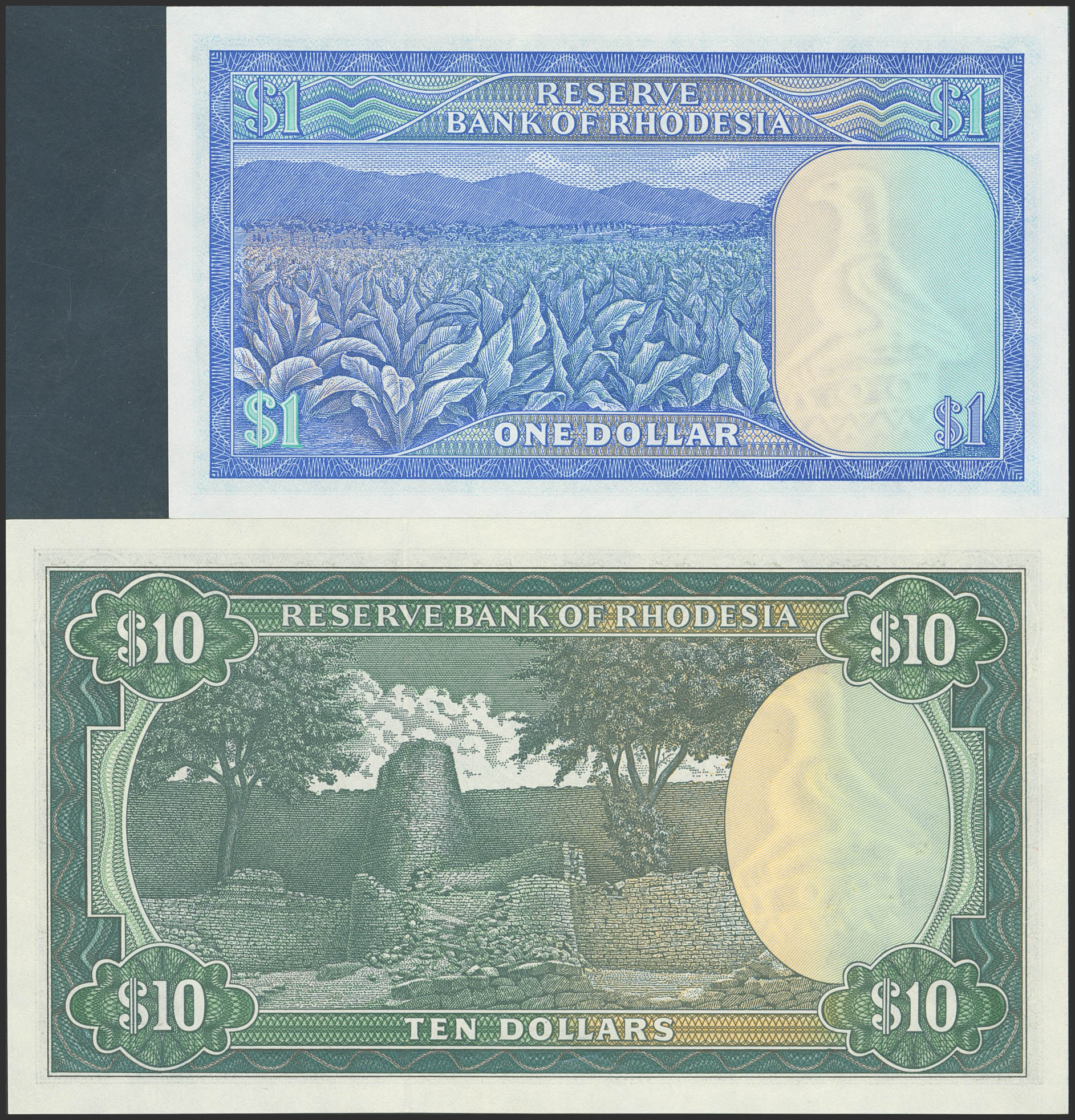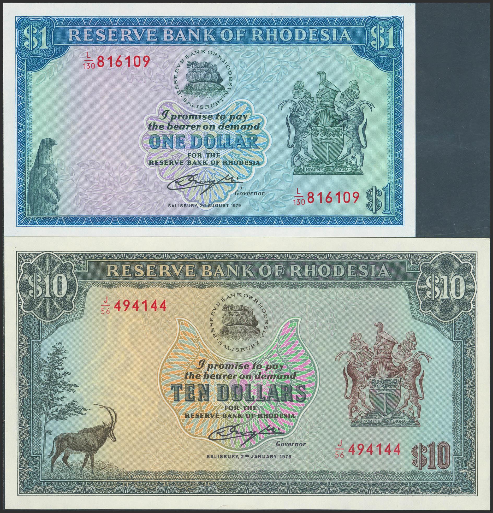RHODESIA. Lot of 2 notes of 1 and 10 Dollars. 1979. Reserve Bank. Watermark Zimbabwe bird. (Pick: 38, 41a). Uncirculated.