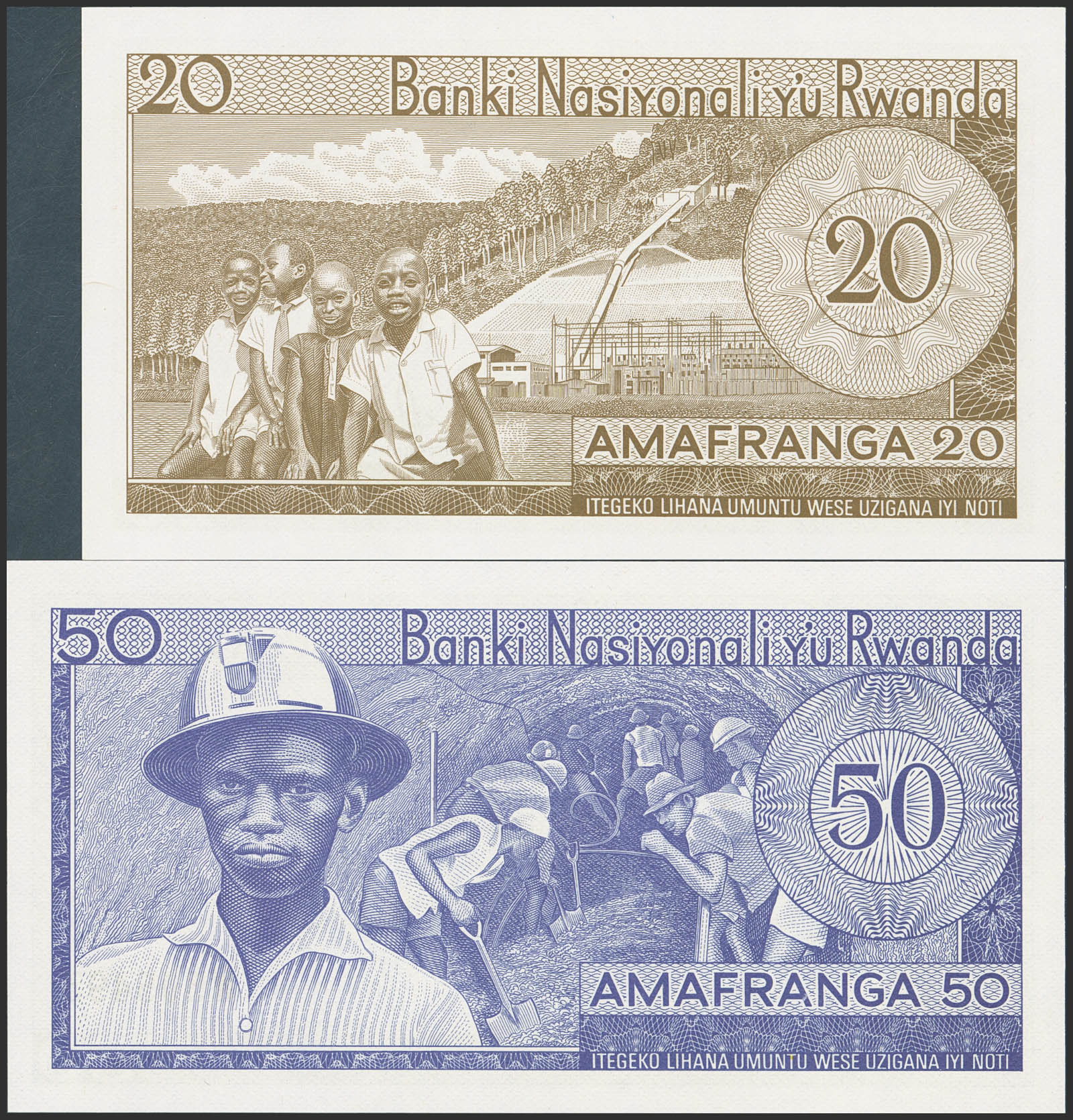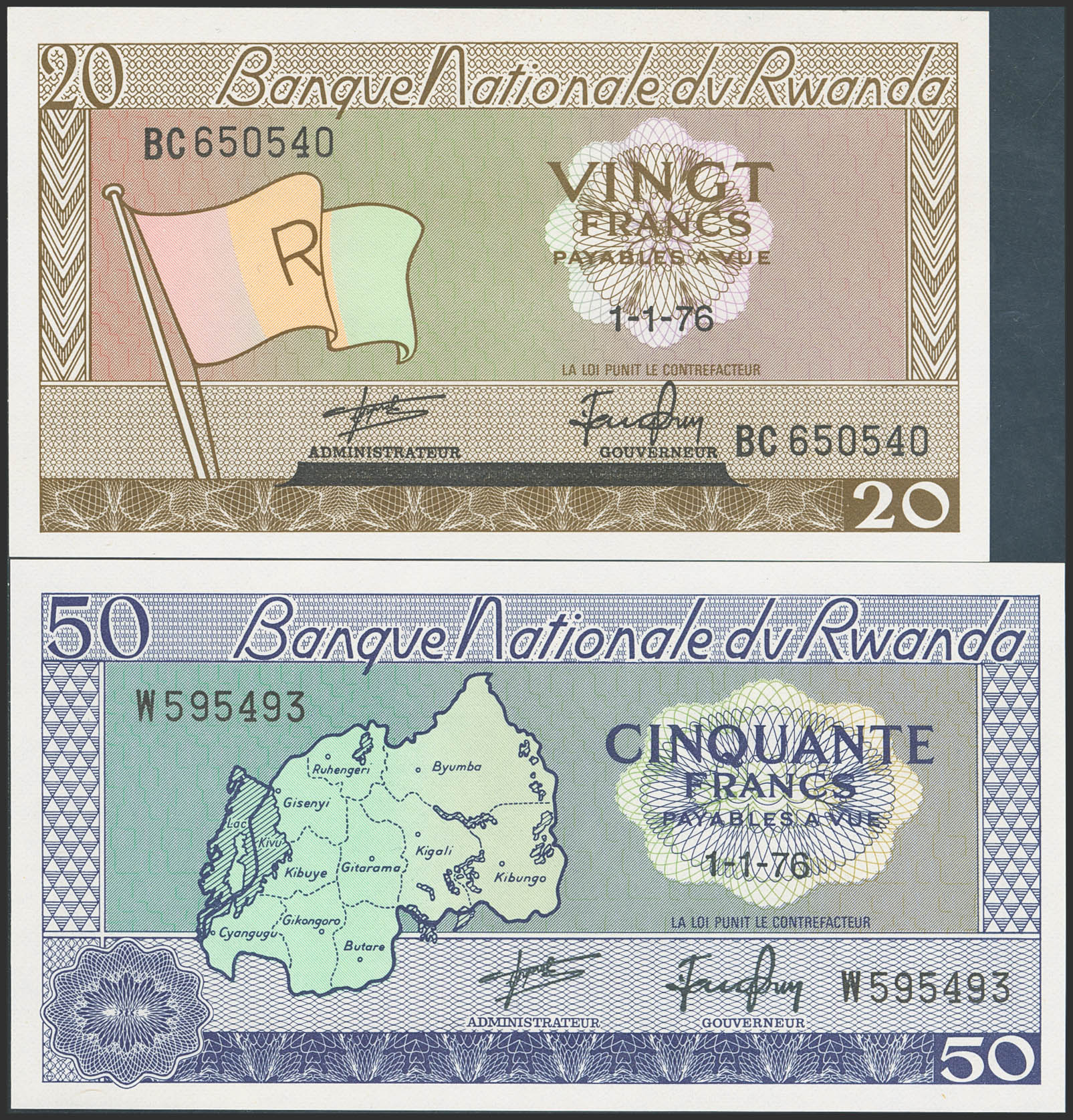RWANDA. Lot of 2 notes of 20 and 50 Francs. 1 January 1976. Banque Nationale. (Pick: 6e, 7c). Uncirculated.