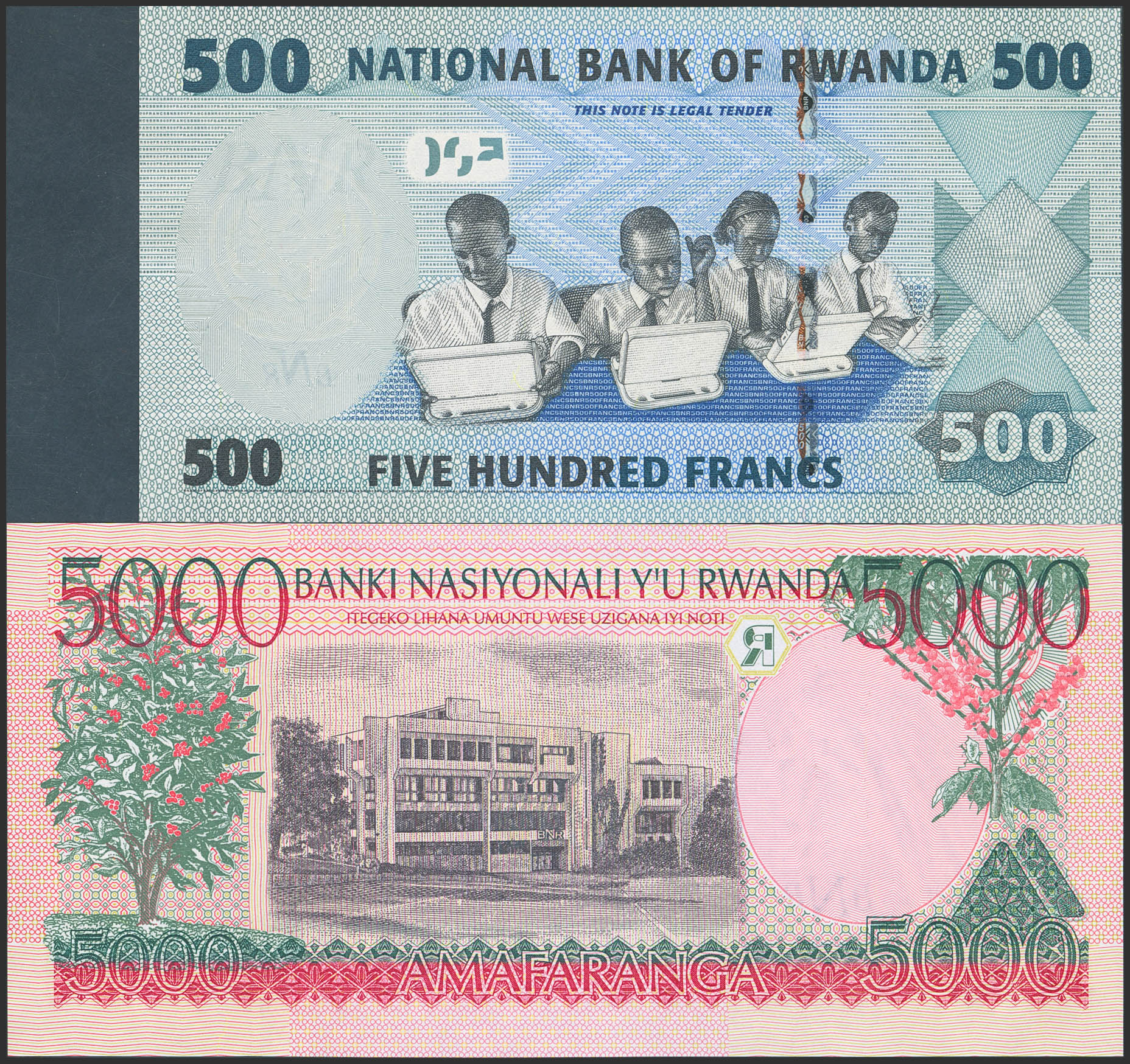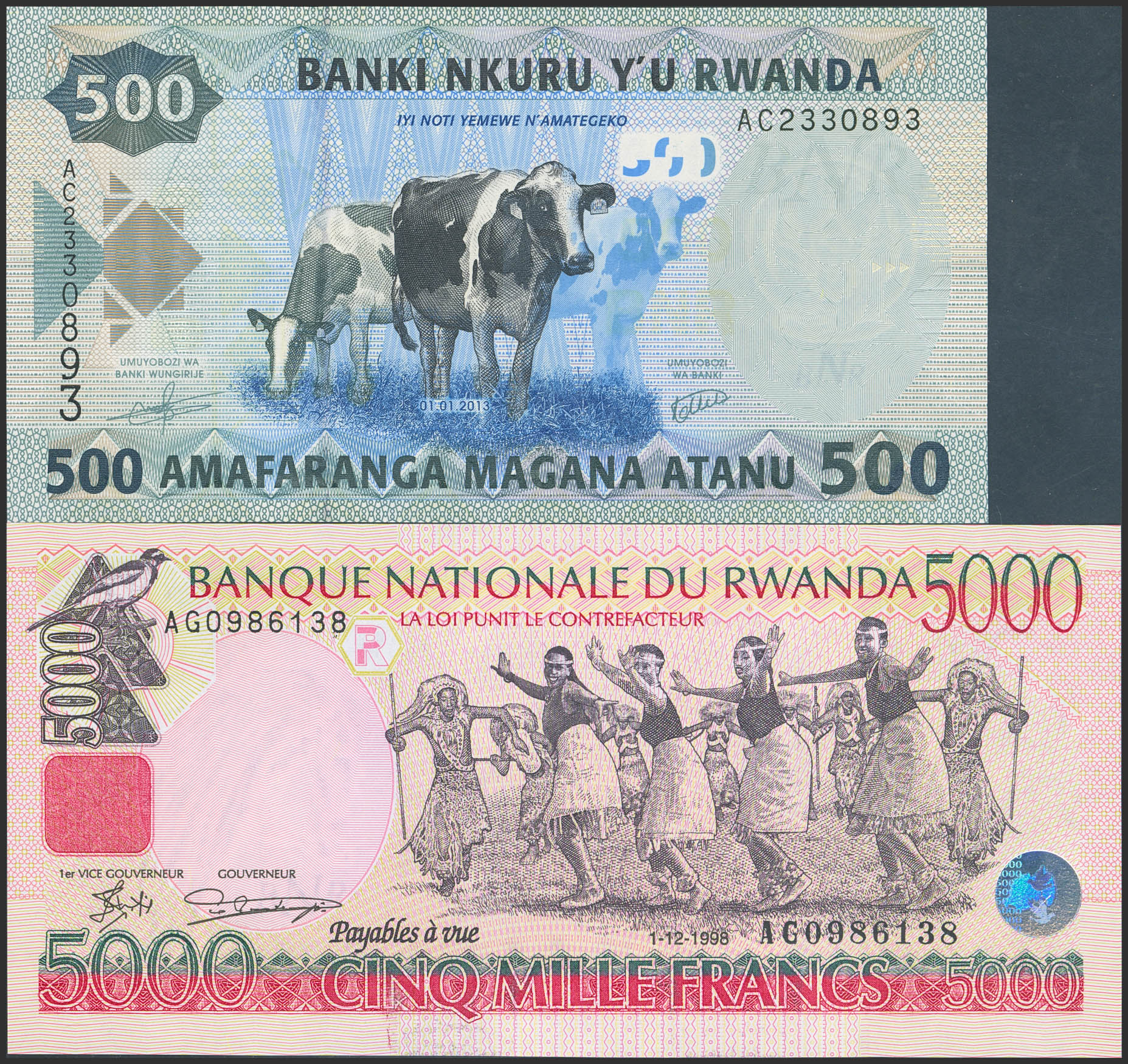 RWANDA. Lot of two notes of 500 and 5000 Francs. 1998 and 2013. Banque Nationale. (Pick: 28a, 38). Uncirculated.