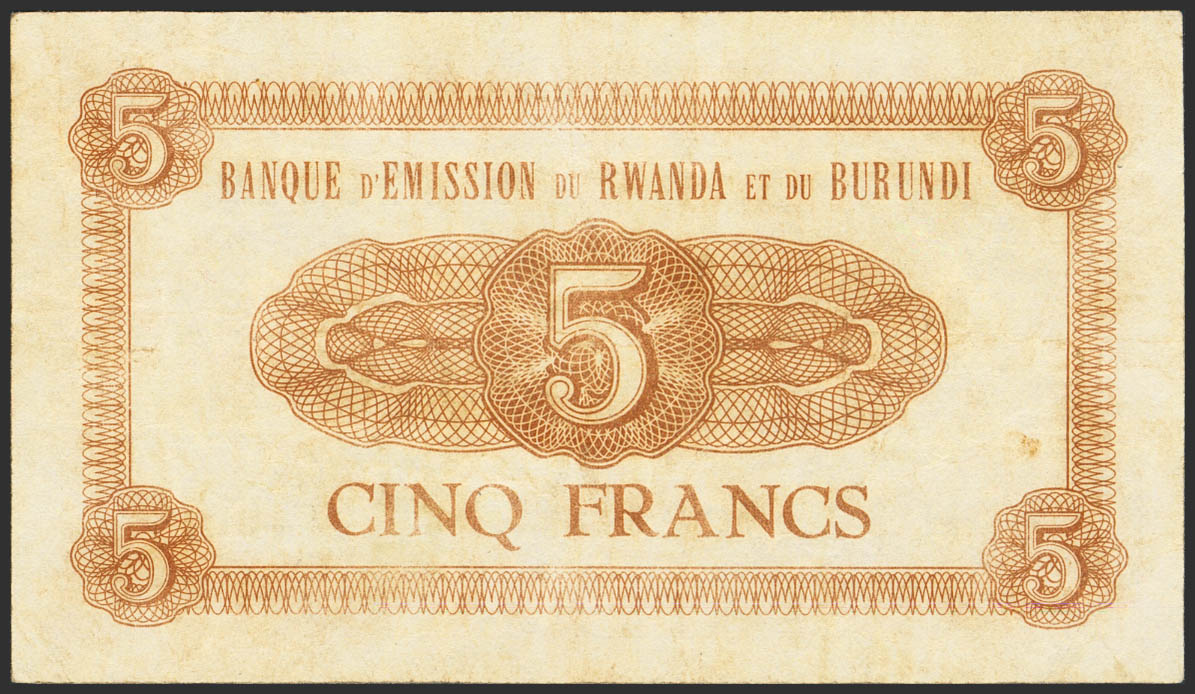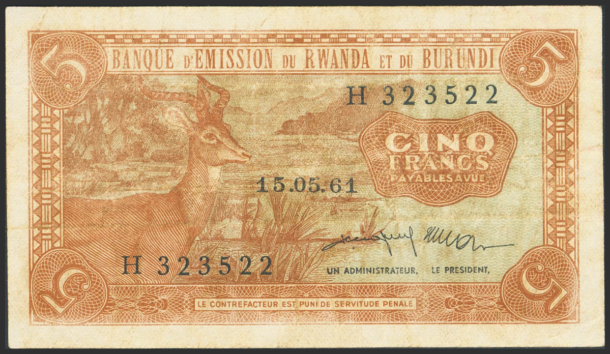 RWANDA-BURUNDI. 5 Francs. 15 May 1961. Banque d'Emission. (Pick: 1a). Extremely Fine.