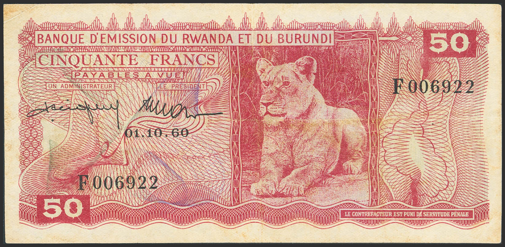 RWANDA-BURUNDI. 50 Francs. 1 October 1960. Banque d'Emission. (Pick: 4a). Washed and flattened. Very Fine.