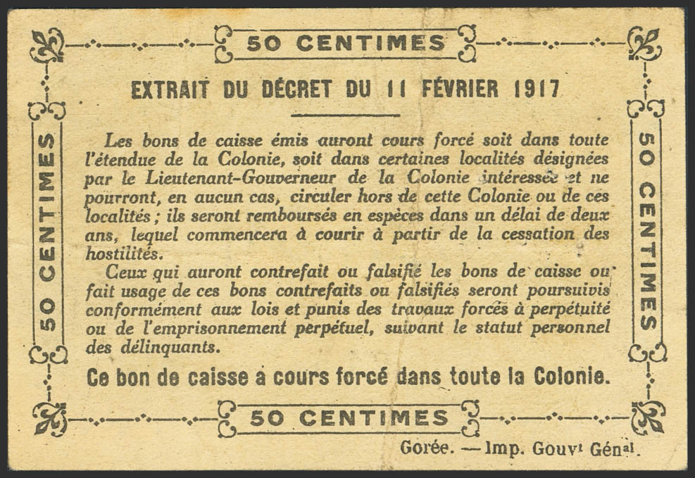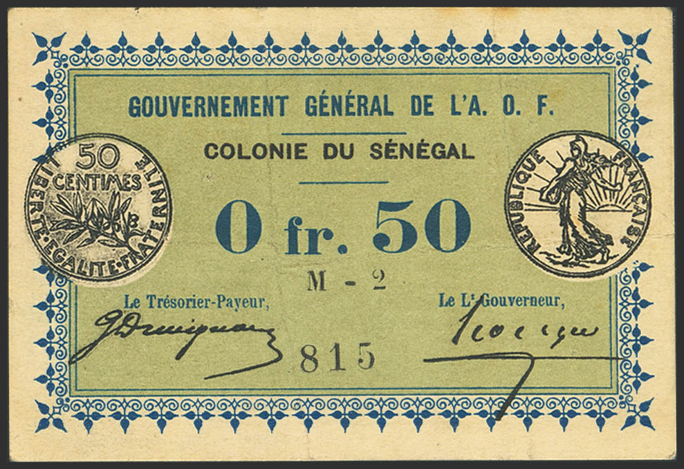 SENEGAL. 0´50 Franc. 11 February 1917. Gouvernement General de l'Afrique Occidentale Francaise. Colonie Du Senegal. (Pick: 1c). 5 pinholes. More than Very Fine.