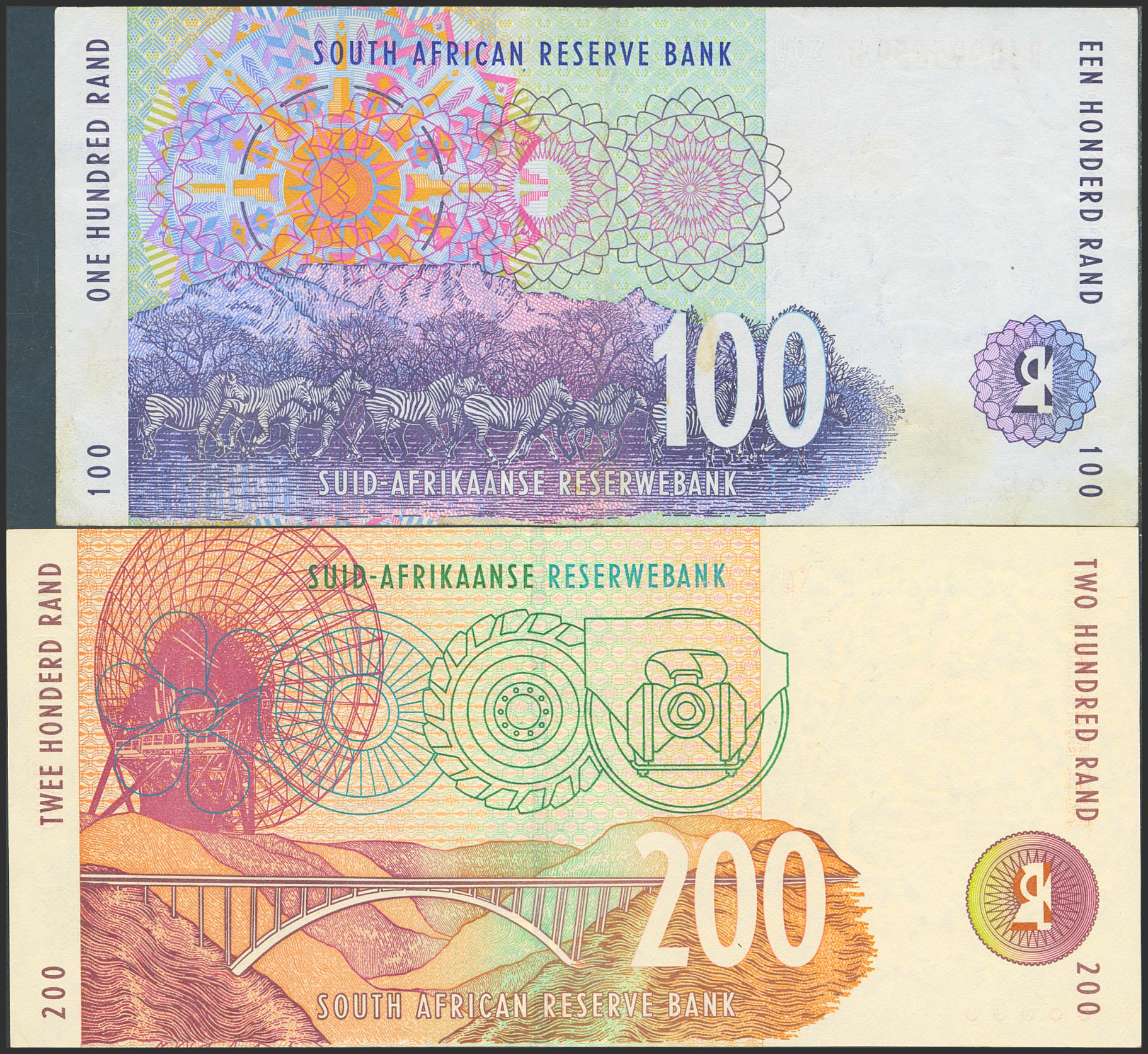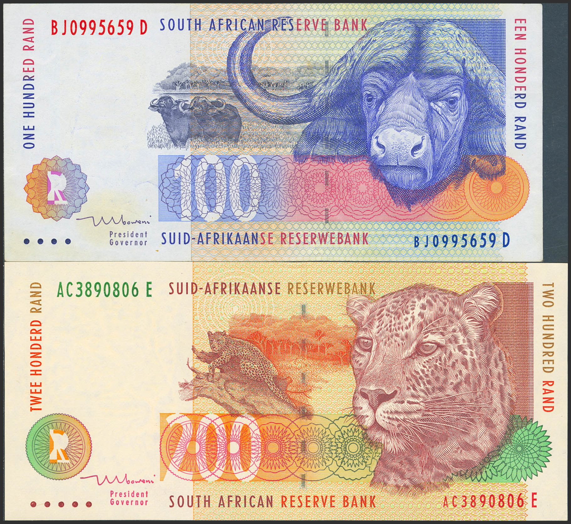 SOUTH AFRICA. Lot of 2 notes of 100 and 200 Rand. (1994ca). Reserve Bank. (Pick: 126b, 127b). Uncirculated (P127) and More than Extremely Fine (P126b).