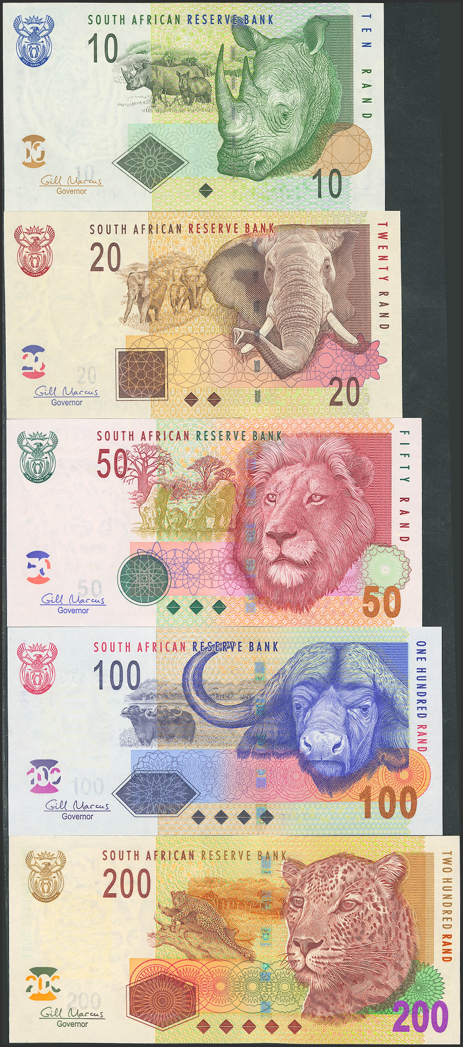 SOUTH AFRICA. Complete set of 5 notes from 10 to 200 Rand. (2005ca). Reserve Bank. (Pick: 128b, 129b, 130b, 131b, 132b). Uncirculated.