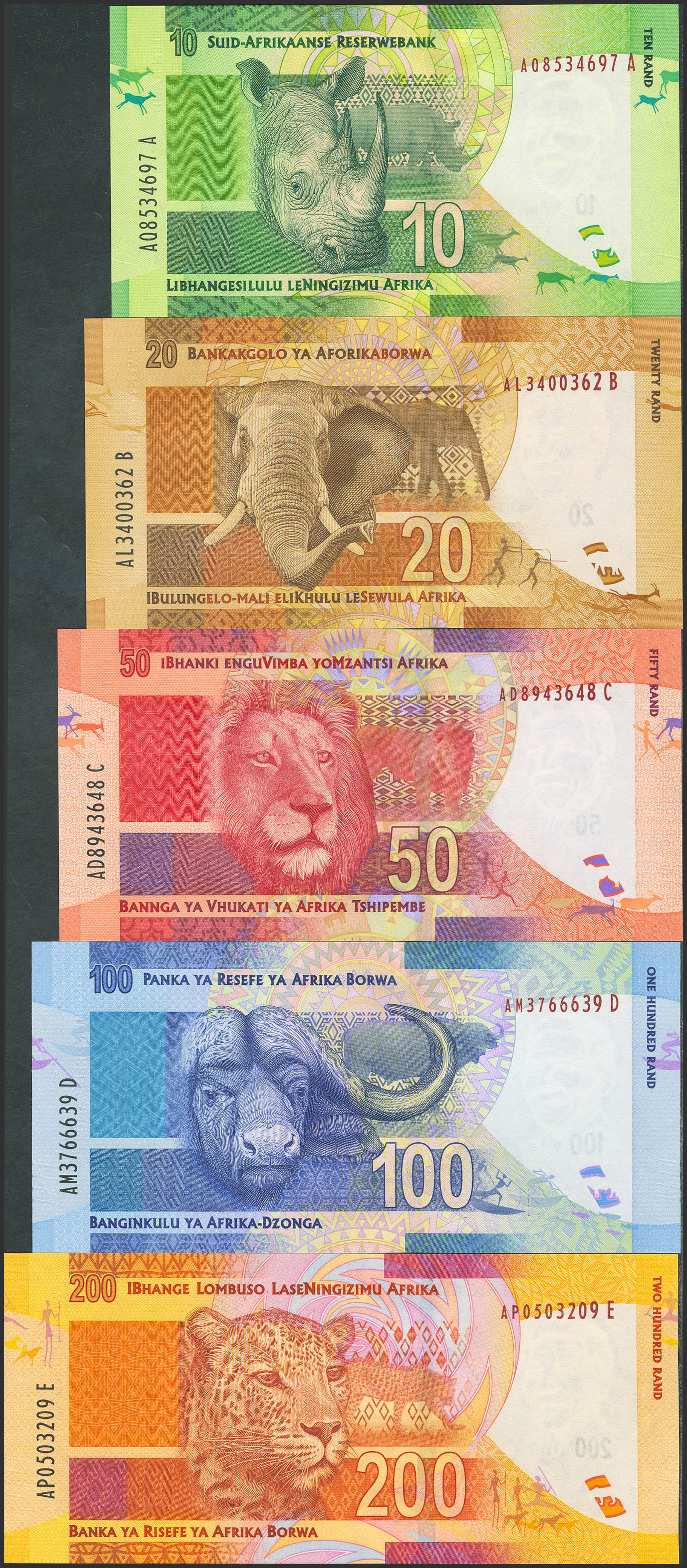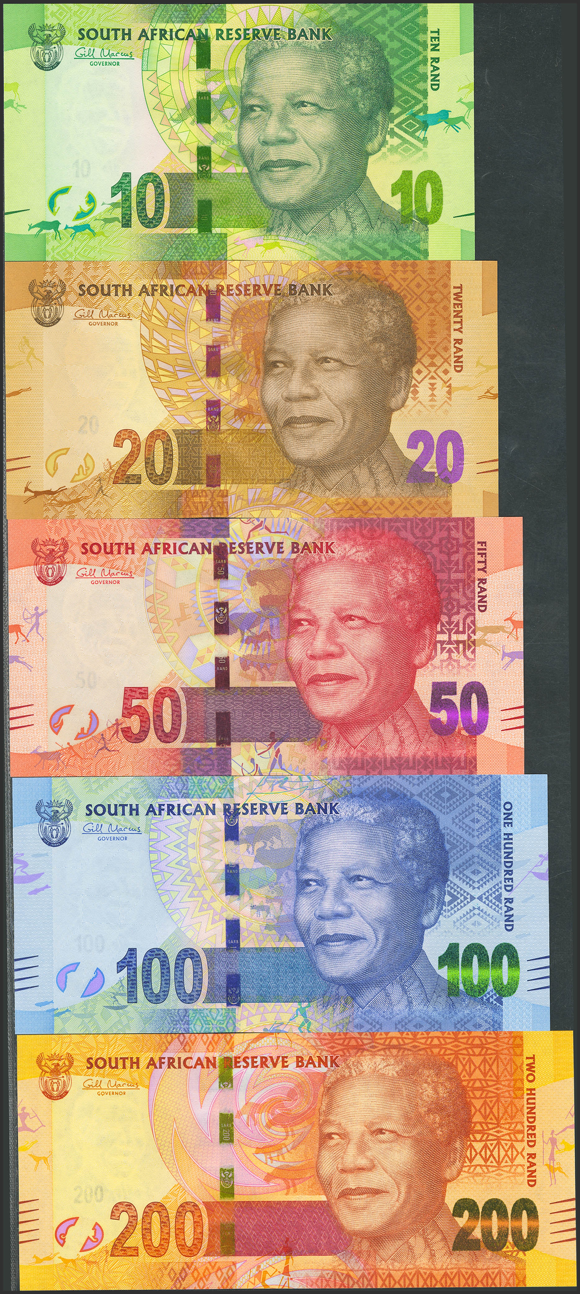 SOUTH AFRICA. Complete set of 5 notes from 10 to 200 Rand. (2012ca). Reserve Bank. (Pick: 133, 134, 135, 136, 137). Uncirculated.